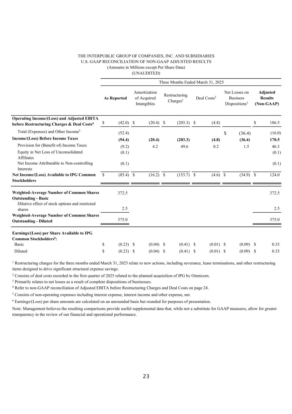 23国际公司集团有限公司。和子公司截至3月31日的三个月非公认会计准则调整后业绩的美国通用会计准则对账(以百万计,每股数据除外)(未经审计),2025年报告的收购无形资产重组费用摊销1交易成本2业务处置净亏损3调整后业绩(非公认会计准则)营业收入/(亏损)和调整后EBITA(未计重组费用和交易成本)4 $(42.0)$(20.4)$(203.3)$(4.8)$ 186.5总计(费用)和其他收入5(52.4)$(36.4)(16.0)所得税前收入/(亏损)(94.4)(20.4)(203.3)(4.8)(36.4)170.5所得税拨备(受益)(9.2)4.249.6 0.2 1.5 46.3未合并关联公司净亏损中的权益(0.1)(0.1)归属于非控股权益的净利润(0.1)(0.1)可供IPG普通股股东使用的净收入/(亏损)$(85.4)$(16.2)$(153.7)$(4.6)$(34.9)$ 124.0加权平均已发行普通股股数-基本372.5372.5股票期权的稀释影响和限制性股票2.5 2.5加权平均已发行普通股数量-摊薄后375.03 75.0 IPG普通股股东可获得的每股收益/(亏损)6:基本$(0.23)$(0.04)$(0.41)$(0.01)$(0.09)$ 0.33摊薄后$(0.23)$(0.04)$(0.41)$(0.01)$(0.09)$ 0.33 1截至2025年3月31日止三个月的重组费用与新行动有关,包括遣散费、终止租约以及旨在推动重大结构性费用节省的其他重组项目。2包括2025年第一季度记录的与宏盟计划收购IPG相关的交易成本。3主要与完全处置业务导致的净亏损有关。4请参阅第24页调整后EBITA在重组费用和交易成本之前的非GAAP对账。5由营业外支出包括利息支出、利息收入和其他支出组成,净额。6每股收益/(亏损)金额按未四舍五入的基础计算,但为列报目的四舍五入。注:管理层认为,由此产生的比较提供了有用的补充数据,这些数据虽然不能替代GAAP衡量标准,但允许在审查我们的财务和运营业绩时提高透明度。