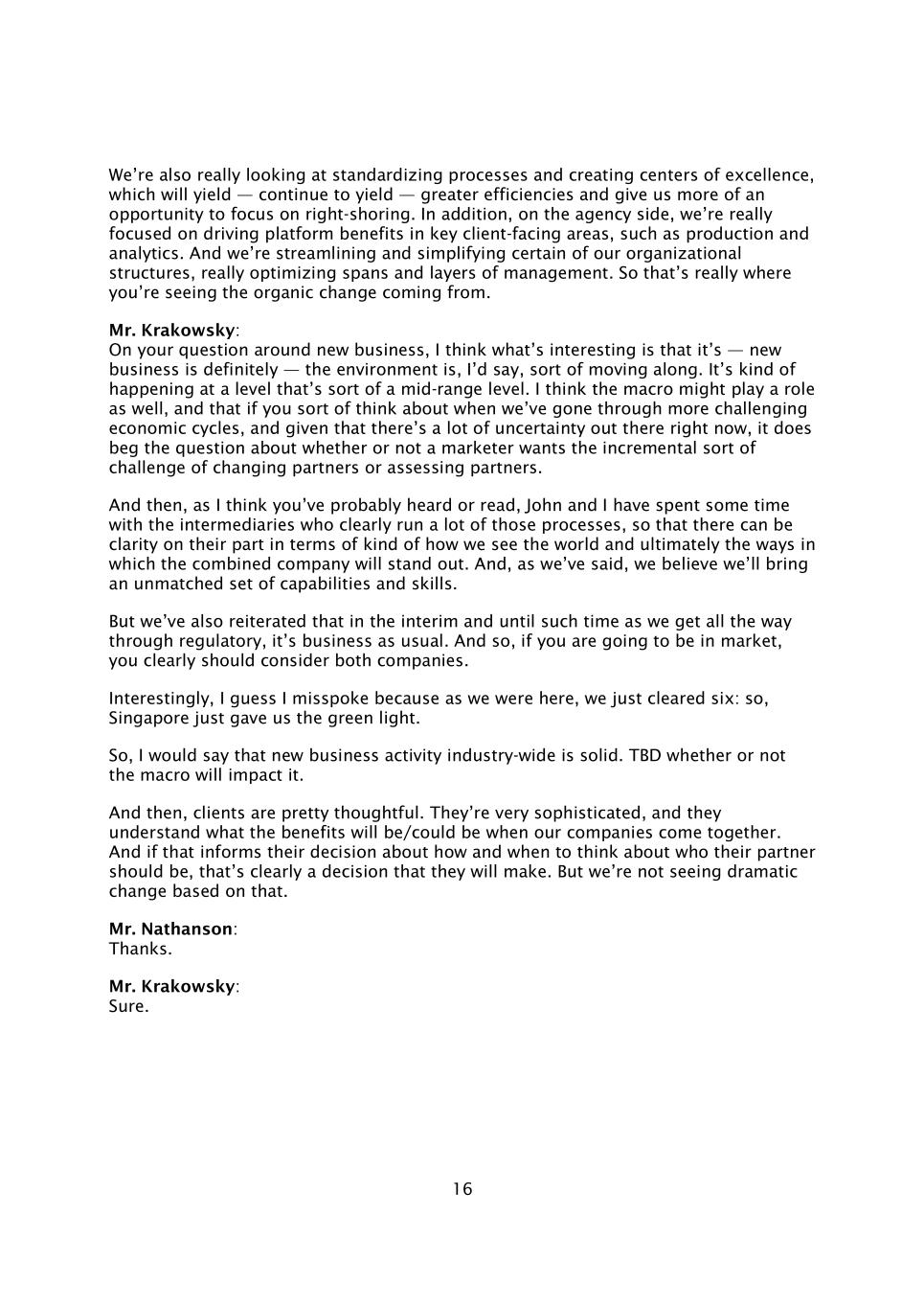 16我们还真正在考虑标准化流程和创建卓越中心,这将产生——继续产生——更高的效率,并给我们更多机会专注于右倾。此外,在代理方面,我们真正专注于推动面向客户的关键领域的平台收益,例如生产和分析。我们正在精简和简化我们的某些组织结构,真正优化了管理的跨度和层次。所以这就是你真正看到有机变化的地方。Krakowsky先生:关于你关于新业务的问题,我认为有趣的是它——新业务肯定是——环境,我想说,是在某种程度上向前发展。这是在某种中等水平上发生的。我认为宏观经济可能也会发挥作用,如果你想想我们何时经历了更具挑战性的经济周期,并且考虑到目前存在很多不确定性,这确实引出了一个问题,即营销人员是否想要改变合作伙伴或评估合作伙伴的增量挑战。然后,我想你可能听说过或读到过,约翰和我花了一些时间与显然运行了很多这些流程的中介机构,这样他们就可以在我们如何看待世界以及最终合并后的公司将以何种方式脱颖而出方面有明确的认识。而且,正如我们所说,我们相信我们将带来一套无与伦比的能力和技能。但我们也重申,在过渡期间,直到我们完全通过监管,一切照常。因此,如果你要进入市场,你显然应该同时考虑这两家公司。有趣的是,我猜我说错了,因为当我们在这里时,我们刚刚清除了六个:所以,新加坡刚刚给我们开了绿灯。所以,我想说,新的商业活动全行业是坚实的。待定宏观是否会对其产生影响。然后,客户相当周到。他们非常老练,他们明白当我们的公司走到一起时会/可能会有什么好处。如果这让他们决定如何以及何时考虑他们的伴侣应该是谁,那显然是他们将做出的决定。但我们并没有看到基于这一点的巨大变化。Nathanson先生:谢谢。Krakowsky先生:当然。