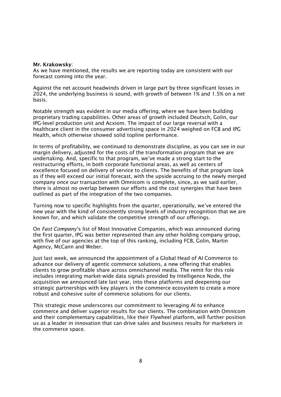 8 Krakowsky先生:正如我们已经提到的,我们今天报告的结果与我们对进入今年的预测是一致的。面对2024年三次重大亏损在很大程度上导致的净账户逆风,基础业务稳健,净增长在1%至1.5%之间。显着的实力体现在我们的媒体产品上,我们一直在建立自营交易能力。其他增长领域包括Deutsch、Golin、我们的IPG级别生产部门和Acxiom。我们在2024年与消费者广告领域的一个医疗保健客户的大幅反转的影响给FCB和IPG健康带来了压力,否则它们的营收表现稳健。在盈利能力方面,我们继续展示纪律,正如您在我们的保证金交付中看到的那样,根据我们正在进行的转型计划的成本进行了调整。而且,具体到该计划,我们在重组努力方面已经有了一个强有力的开端,既有企业职能领域,也有专注于向客户提供服务的卓越中心。该计划的好处看起来似乎将超过我们最初的预测,一旦我们与宏盟的交易完成,新合并的公司将获得上行空间,因为正如我们之前所说,我们的努力与作为两家公司整合的一部分而概述的成本协同效应之间几乎没有重叠。现在转向本季度的具体亮点,在运营方面,我们以我们所熟知的那种持续强劲的行业认可水平进入了新的一年,这验证了我们产品的竞争实力。在第一季度公布的Fast Company最具创新力公司榜单上,IPG的代表性超过了任何其他控股公司集团,我们有五家机构在这一排名中名列前茅,包括FCB、Golin、Martin Agency、McCann和Weber。就在上周,我们宣布任命一位AI Commerce全球负责人,以推进我们交付代理商务解决方案,这是一项新产品,使客户能够在全渠道媒体上增加盈利份额。这一角色的职责包括将Intelligence Node(我们去年年底宣布的收购)提供的全市场数据信号整合到这些平台中,并深化我们与商业生态系统主要参与者的战略合作伙伴关系,为我们的客户创建一套更强大、更有凝聚力的商业解决方案。这一战略举措强调了我们致力于利用人工智能来增强商业并为我们的客户提供卓越的结果。与Omnicom的结合以及他们的互补能力,就像他们的Flywheel平台一样,将进一步将我们定位为创新的领导者,可以为商业领域的营销人员带来销售和业务成果。