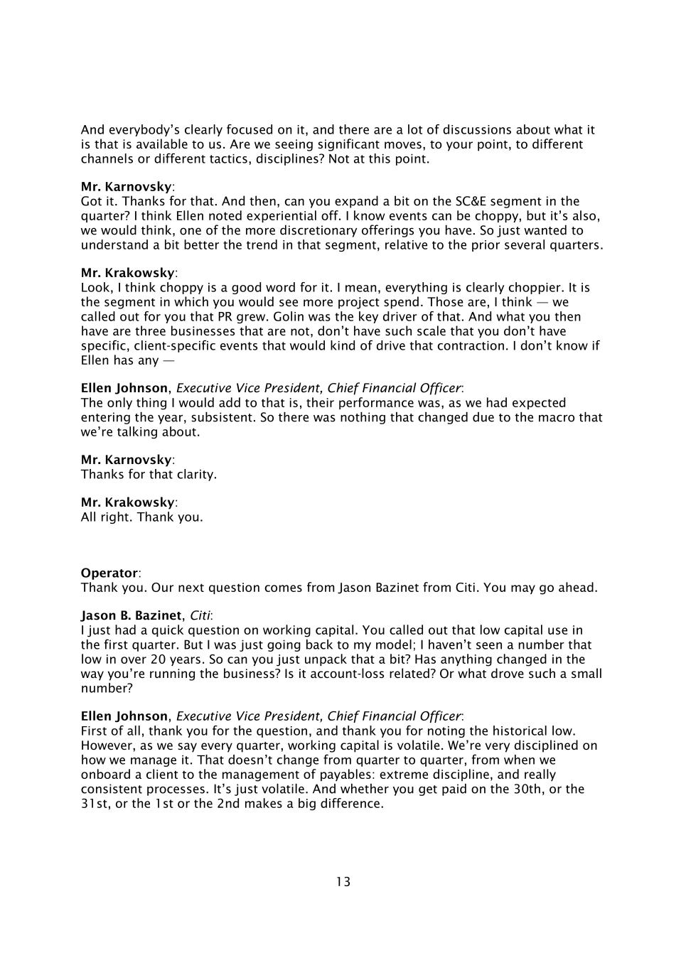 13每个人都清楚地专注于它,并且有很多关于它是什么可供我们使用的讨论。我们是否看到了重大举措,就你的观点而言,转向不同的渠道或不同的战术、纪律?不是在这一点上。卡诺夫斯基先生:明白了。谢谢你。然后,您能否在本季度扩展一下SC & E细分市场?我认为艾伦注意到了体验式的关闭。我知道活动可能会很不稳定,但我们认为,这也是你拥有的更多可自由支配的产品之一。所以只是想更好地理解该细分领域的趋势,相对于前几个季度。Krakowsky先生:听着,我认为波涛汹涌是一个很好的词。我的意思是,一切显然都更加波涛汹涌。这是你会看到更多项目支出的细分领域。我认为,这些是——我们为你呼吁公关增长。戈林是这方面的关键驱动力。然后你所拥有的是三个业务,它们没有,没有这样的规模,以至于你没有特定的、特定于客户的事件,这会推动这种收缩。我不知道Ellen是否有任何——执行副总裁兼首席财务官Ellen Johnson:我唯一要补充的是,正如我们在进入今年时所预期的那样,他们的业绩仍然存在。因此,由于我们正在讨论的宏观,没有发生任何变化。卡尔诺夫斯基先生:感谢您的澄清。克拉科夫斯基先生:好的。谢谢你。接线员:谢谢。我们的下一个问题来自花旗的Jason Bazinet。你可以先走了。Jason B. Bazinet,花旗:我刚刚有一个关于营运资金的简短问题。你喊出了第一季度的低资本使用。但我只是回到我的模型;20多年来,我还没有见过这么低的数字。所以你能不能把它拆开一点?你经营企业的方式有什么变化吗?是否与账户亏损有关?或者是什么推动了这么小的数字?执行副总裁、首席财务官Ellen Johnson:首先感谢您的提问,感谢您注意到历史低位。然而,正如我们每个季度所说的那样,营运资本是不稳定的。我们在如何管理它方面非常自律。从客户入职到应付账款管理,每个季度的情况都不会改变:极端的纪律,以及真正一致的流程。这只是不稳定。无论你是在30日,还是31日,还是1日或2日获得报酬,都有很大的不同。