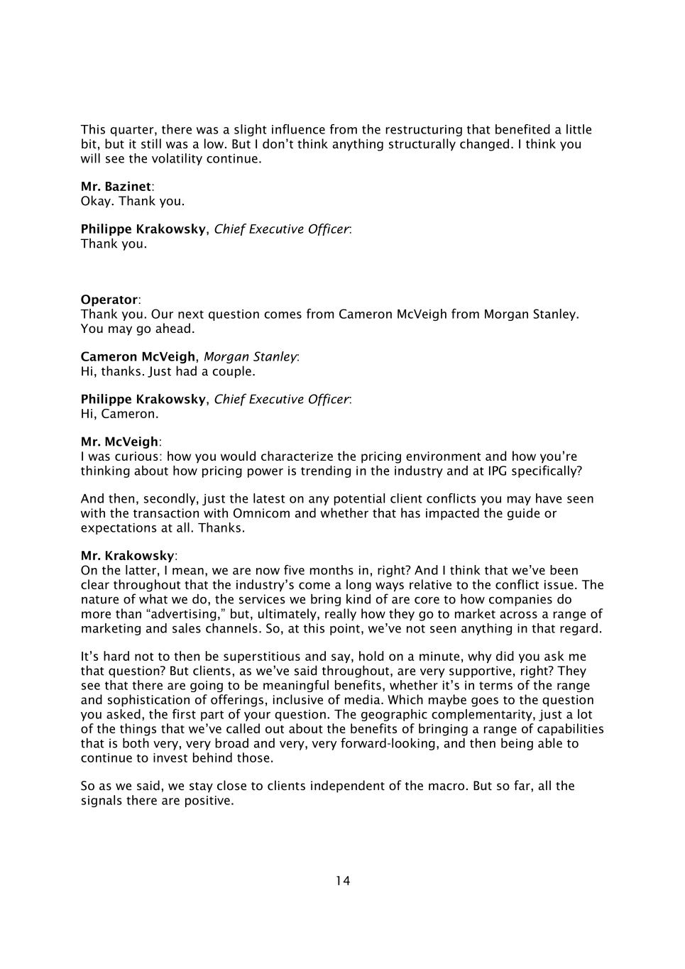 14本季度略有受益于重组的影响,但仍是低点。但我认为没有任何结构性变化。我认为你会看到波动继续下去。Bazinet先生:好的。谢谢你。首席执行官Philippe Krakowsky:谢谢。接线员:谢谢。我们的下一个问题来自摩根士丹利的Cameron McVeigh。你可以先走了。Cameron McVeigh,摩根士丹利:您好,谢谢。刚有一对。首席执行官Philippe Krakowsky:您好,卡梅伦。麦克维先生:我很好奇:你们将如何描述定价环境,以及你们如何看待定价能力在行业中的趋势,特别是在IPG?其次,只是你可能看到的与宏盟交易的任何潜在客户冲突的最新情况,以及这是否影响了指南或预期。谢谢。Krakowsky先生:关于后者,我的意思是,我们现在已经五个月了,对吗?我认为,我们自始至终都清楚,相对于冲突问题,该行业已经取得了长足的进步。我们所做的事情的本质,我们所带来的服务是公司如何做的核心,而不是“广告”,但最终,实际上是他们如何跨越一系列营销和销售渠道进入市场。因此,在这一点上,我们还没有看到这方面的任何情况。很难不那么迷信的说,等一下,你为什么问我这个问题?但客户,正如我们自始至终所说的,非常支持,对吧?他们看到将会有有意义的好处,无论是在产品的范围和复杂性方面,包括媒体。这可能会涉及到你提出的问题,即你问题的第一部分。地理上的互补性,只是我们提到的很多关于带来一系列能力的好处的事情,这些能力既非常,非常广泛,也非常,非常具有前瞻性,然后能够在这些背后继续投资。正如我们所说,我们与客户保持密切联系,独立于宏观。但到目前为止,所有的信号都是积极的。