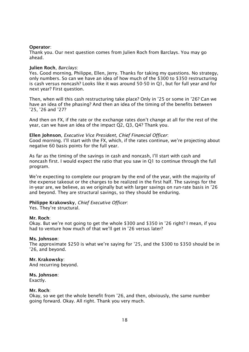 18接线员:谢谢。我们的下一个问题来自巴克莱银行的Julien Roch。你可以先走了。Julien Roch,巴克莱银行:是的。早上好,菲利普,艾伦,杰瑞。感谢您回答我的问题。没有策略,只有数字。那么,我们能否了解一下,在300美元到350美元的重组中,有多少是现金而不是非现金?看起来Q1是50-50左右,但全年和明年?第一个问题。那么,这次现金重组什么时候进行?只在25年还是在26年?我们能对分阶段有个想法吗?然后对‘25,’26和' 27之间的收益时机有个想法?然后在外汇方面,如果汇率或汇率在今年剩下的时间里完全没有变化,我们能否对Q2、Q3、Q4的影响有所了解?谢谢你。执行副总裁、首席财务官Ellen Johnson:早上好。我将从外汇开始,如果利率继续下去,我们预计全年将为负60个基点。至于现金和非现金储蓄的时间,我先从现金和非现金开始。我希望你在第一季度看到的比率将在整个项目中继续下去。我们预计在年底完成我们的计划,大部分费用外卖或收费将在上半年实现。我们认为,年内的节省与我们最初一样,但在26年及以后的运行率基础上有更大的节省。它们是结构性储蓄,所以它们应该是持久的。首席执行官Philippe Krakowsky:是的。它们是结构性的。Roch先生:好的。但我们不会在26年得到全部300美元和350美元,对吗?我的意思是,如果你必须冒险,我们将在26年和之后得到多少?约翰逊女士:大约250美元就是我们所说的25年,300美元到350美元应该在26年,甚至更久。Krakowsky先生:并反复出现在更远的地方。约翰逊女士:没错。罗奇:好的,所以我们从26年得到了全部好处,然后,很明显,同样的数字向前发展。好的。好吧。非常感谢。