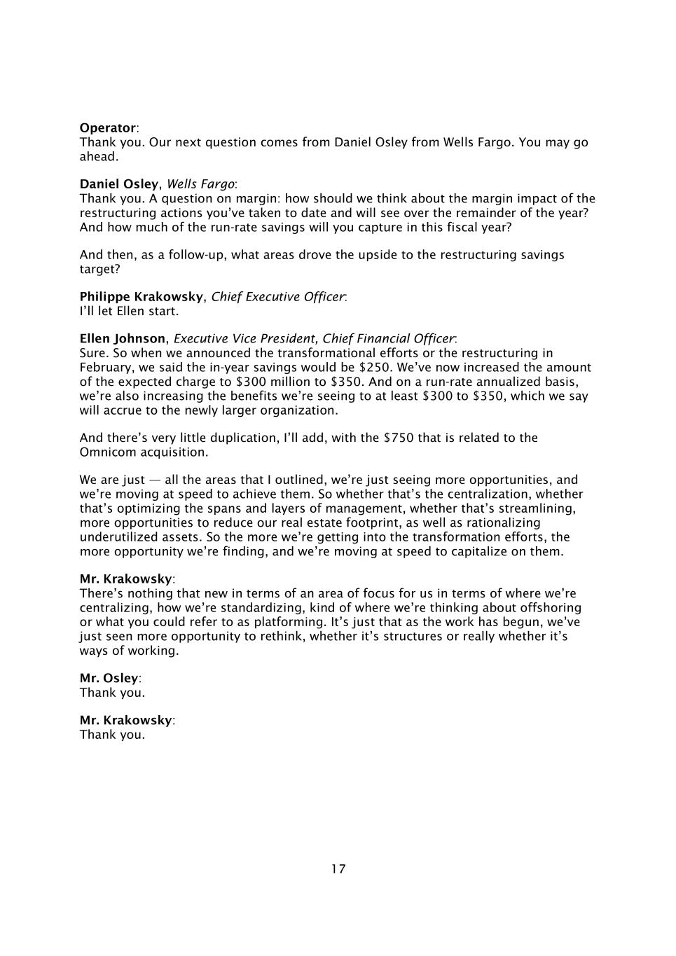 17接线员:谢谢。我们的下一个问题来自富国银行的Daniel Osley。你可以先走了。富国银行 Daniel Osley:谢谢。关于保证金的问题:我们应该如何看待你们迄今为止所采取的重组行动以及将在今年剩余时间内看到的保证金影响?本财年你将获得多少运行率节省?而接下来,作为后续,哪些领域带动了重组节约型标的的上行?首席执行官Philippe Krakowsky:我会让Ellen开始。执行副总裁、首席财务官Ellen Johnson:当然。因此,当我们在2月份宣布转型努力或重组时,我们说年内节省将是250美元。我们现在已将预期收费金额提高到3亿至350美元。在运行率年化的基础上,我们还将看到的收益增加到至少300到350美元,我们说这将为新成立的更大的组织带来收益。我要补充的是,与宏盟收购相关的750美元几乎没有重复。我们只是——我概述的所有领域,我们只是看到了更多的机会,我们正在迅速实现这些机会。因此,这是否是集中化,是否是优化管理的跨度和层次,是否是精简,减少我们房地产足迹的更多机会,以及使未充分利用的资产合理化。因此,我们越是投入转型努力,就越能找到机会,我们正迅速采取行动,利用这些机会。Krakowsky先生:就我们正在集中的领域、我们如何标准化、我们正在考虑离岸外包的领域或你可以称之为平台化的领域而言,没有什么是新的。只是随着这项工作的开始,我们刚刚看到了更多重新思考的机会,无论是结构,还是真正的工作方式。奥斯利先生:谢谢。克拉科夫斯基先生:谢谢。