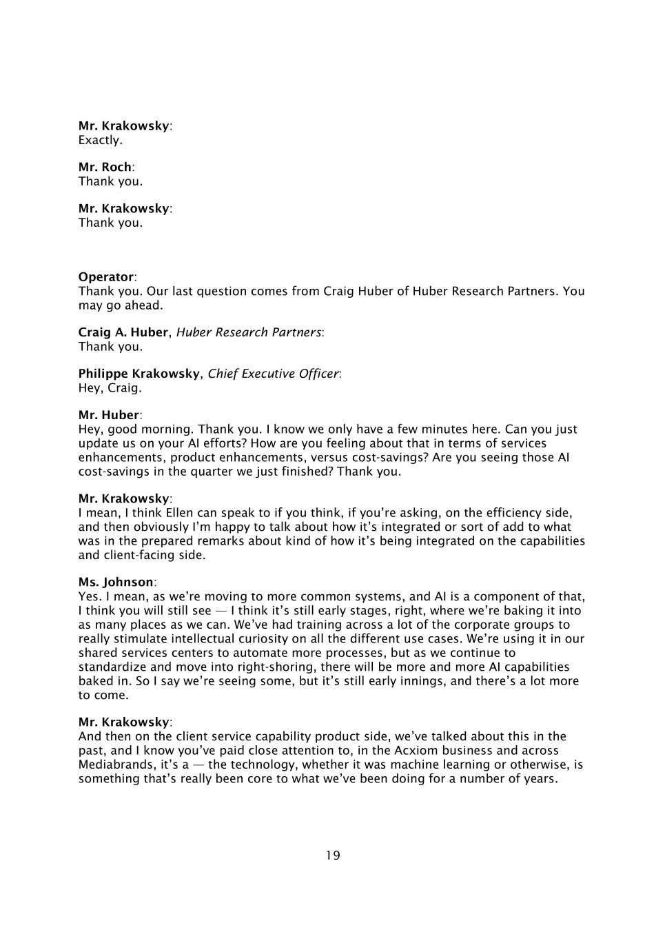 19 Krakowsky先生:没错。Roch先生:谢谢。克拉科夫斯基先生:谢谢。接线员:谢谢。我们的最后一个问题来自Huber Research Partners的Craig Huber。你可以先走了。Huber Research Partners Craig A. Huber:谢谢。首席执行官Philippe Krakowsky:嘿,克雷格。Huber先生:嘿,早上好。谢谢你。我知道我们在这里只有几分钟的时间。你能向我们介绍一下你在AI方面的努力吗?在服务增强、产品增强与成本节约方面,您对此有何看法?你是否在我们刚刚结束的季度看到了那些人工智能成本节约?谢谢你。Krakowsky先生:我的意思是,我认为,如果你认为,如果你问,在效率方面,Ellen可以与之交谈,然后显然我很乐意谈论它是如何被整合的,或者在某种程度上增加了准备好的评论中关于它是如何在能力和面向客户方面被整合的内容。约翰逊女士:是的。我的意思是,随着我们正在转向更常见的系统,而人工智能是其中的一个组成部分,我想你仍然会看到——我认为它仍然是早期阶段,对,我们正在尽可能多地将它烘焙到这些地方。我们对很多企业集团进行了培训,以真正激发对所有不同用例的求知欲。我们正在共享服务中心使用它,以实现更多流程的自动化,但随着我们继续标准化并转向右倾,将会有越来越多的人工智能功能被嵌入其中。所以我说我们看到了一些,但现在还处于早期阶段,还有更多。Krakowsky先生:然后在客户端服务能力产品方面,我们过去讨论过这个问题,我知道你们已经密切关注,在Acxiom业务和整个Mediabrands中,这是一个——技术,无论是机器学习还是其他方面,都是我们多年来一直在做的事情的核心。