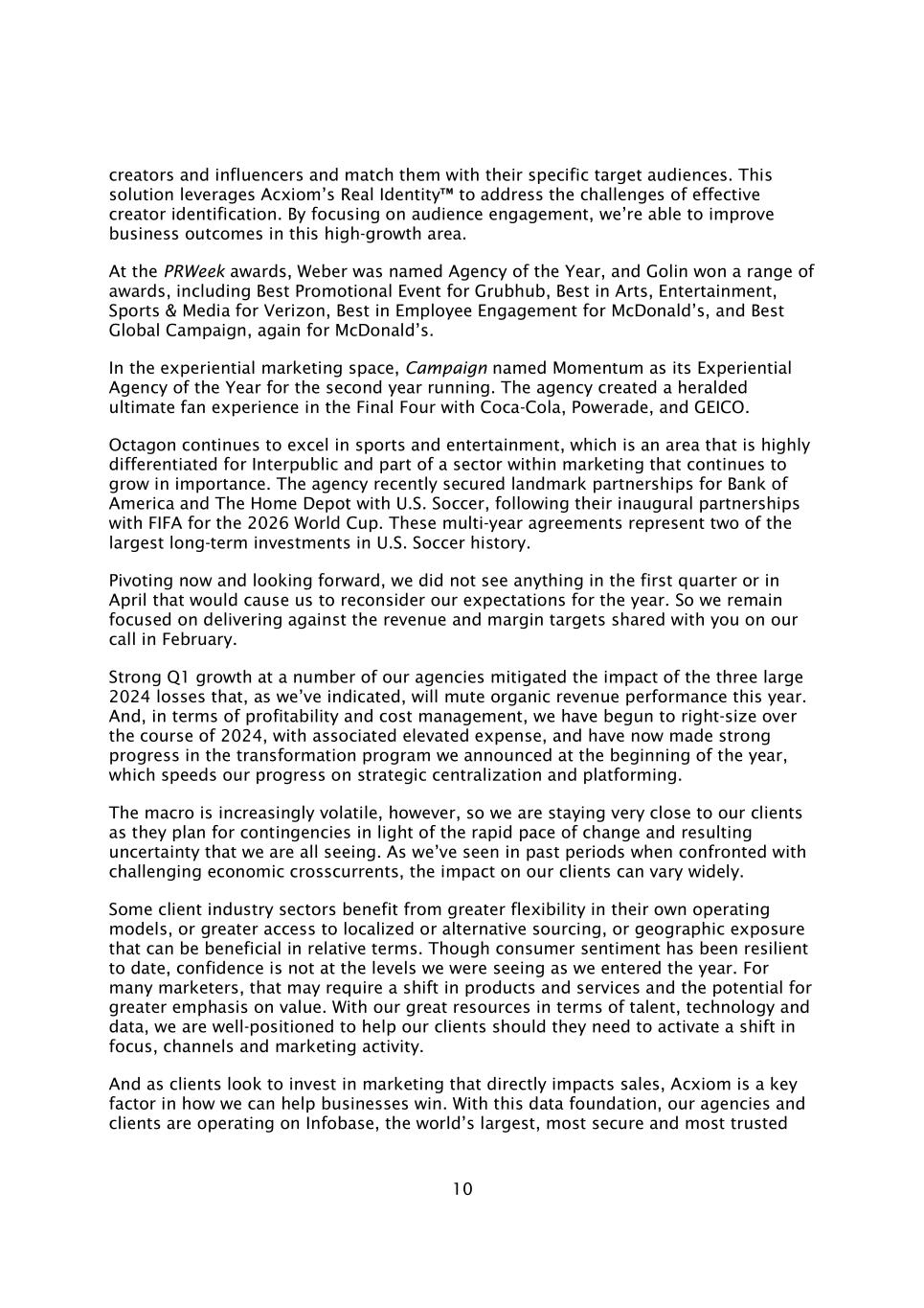 10位创作者和影响者,并将他们与特定目标受众进行匹配。该解决方案利用了Acxiom的真实身份™应对有效创作者身份识别的挑战。通过关注观众参与度,我们能够在这个高增长领域提高业务成果。在PRWeek颁奖典礼上,韦伯被评为年度最佳经纪公司,戈林赢得了一系列奖项,包括Grubhub的最佳宣传活动、威瑞森通信的最佳艺术、娱乐、体育与媒体、麦当劳的最佳员工敬业度以及麦当劳的最佳全球活动。在体验式营销领域,Campaign连续第二年将Momentum评为年度体验式机构。该机构与可口可乐、Powerade和GEICO在四强赛中打造了堪称先驱的终极粉丝体验。Octagon在体育和娱乐领域继续表现出色,这对InterPublic来说是一个高度差异化的领域,也是市场营销中一个重要性持续增长的部门的一部分。该机构最近与美国足球协会(U.S. Soccer)建立了里程碑式的合作伙伴关系,此前他们与国际足联(FIFA)首次建立了2026年世界杯的合作伙伴关系。这些多年协议代表了美国足球史上最大的两笔长期投资。现在转向并向前看,我们在第一季度或4月份没有看到任何东西会导致我们重新考虑我们对今年的预期。因此,我们仍然专注于实现我们在2月份的电话会议上与您分享的收入和利润率目标。我们多家机构第一季度的强劲增长减轻了2024年三大亏损的影响,正如我们所指出的,这三大亏损将削弱今年的有机收入表现。而且,在盈利能力和成本管理方面,我们已经开始在2024年期间调整规模,相关的费用增加,现在在我们年初宣布的转型计划中取得了强劲进展,这加快了我们在战略集中化和平台化方面的进展。然而,宏观经济越来越不稳定,因此我们与客户保持非常密切的联系,因为他们会根据我们都看到的快速变化和由此产生的不确定性来计划突发事件。正如我们在过去几个时期遇到具有挑战性的经济逆流时所看到的那样,对我们客户的影响可能千差万别。一些客户行业部门受益于其自身运营模式的更大灵活性,或更多地获得本地化或替代采购,或相对有利的地理风险敞口。尽管迄今为止消费者信心一直具有韧性,但信心并没有达到我们进入这一年时所看到的水平。对许多营销人员来说,这可能需要产品和服务的转变,以及更多强调价值的潜力。凭借我们在人才、技术和数据方面的巨大资源,我们有能力在客户需要激活重点、渠道和营销活动的转变时为他们提供帮助。当客户希望投资于直接影响销售的营销时,安客诚是我们如何帮助企业取胜的关键因素。有了这个数据基础,我们的机构和客户正在Infobase上运营,这是世界上最大、最安全和最值得信赖的