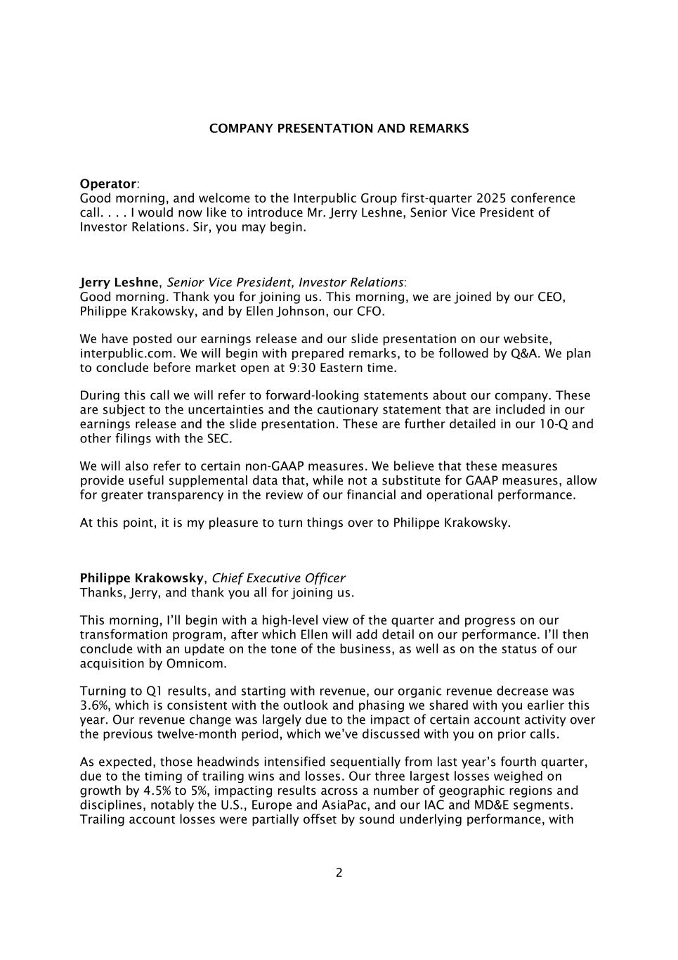2公司介绍及致辞接线员:早上好,欢迎参加InterPublic Group 2025年第一季度电话会议。。。。我现在要介绍的是投资者关系高级副总裁Jerry Leshne先生。先生,可以开始了。投资者关系高级副总裁Jerry Leshne:早上好。感谢您的加入。今天上午,我们的首席执行官Philippe Krakowsky和首席财务官Ellen Johnson加入了我们的行列。我们已在我们的网站interpublic.com上发布了我们的收益发布和幻灯片演示。我们将从准备好的评论开始,随后是问答。我们计划在东部时间9:30开盘前得出结论。在本次电话会议中,我们将参考有关我们公司的前瞻性陈述。这些受制于我们的收益发布和幻灯片演示中包含的不确定性和警示性声明。这些将在我们提交给SEC的10-Q和其他文件中进一步详细说明。我们还将参考某些非公认会计原则措施。我们认为,这些措施提供了有用的补充数据,虽然不能替代GAAP措施,但允许在审查我们的财务和运营业绩时提高透明度。在这一点上,我很荣幸能把事情交给Philippe Krakowsky。Philippe Krakowsky,首席执行官谢谢,杰瑞,也感谢大家加入我们。今天上午,我将首先从高层对本季度的看法和我们转型计划的进展,之后Ellen将补充我们业绩的细节。最后,我将就业务基调以及我们被宏盟收购的状况进行更新。转向第一季度业绩,从收入开始,我们的有机收入减少了3.6%,这与我们今年早些时候与大家分享的前景和阶段一致。我们的收入变化主要是由于过去12个月期间某些账户活动的影响,我们在之前的电话会议上与您讨论过这一点。正如预期的那样,这些不利因素从去年第四季度开始连续加剧,这是由于尾随胜负的时间安排。我们三个最大的亏损对增长造成了4.5%到5%的影响,影响了多个地理区域和学科的业绩,特别是美国、欧洲和亚太经合组织,以及我们的IAC和MD & E部门。追踪账户损失被稳健的基本业绩部分抵消,与