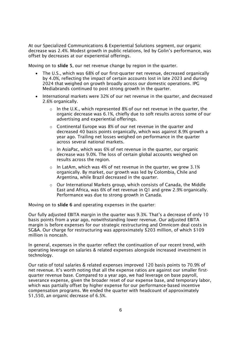 6在我们的专业通信和体验解决方案部门,我们的有机下降为2.4%。在Golin业绩的带动下,公共关系的适度增长被我们体验式产品的减少所抵消。转到幻灯片5,我们本季度按地区划分的净收入变化。美国市场占我们第一季度净营收的68%,有机下降4.0%,这反映了2023年末和2024年损失的某些账户的影响,这些影响广泛影响了我们国内业务的增长。IPG Mediabrands在本季度继续实现强劲增长。国际市场是我们本季度净收入的32%,有机下降2.6%。o在占我们本季度净收入8%的英国,有机下降6.1%,主要是由于我们的一些广告和体验式产品业绩疲软。o欧洲大陆是我们本季度净收入的8%,有机下降40个基点,而一年前的增长率为8.9%。持续的净亏损拖累了几个国家市场本季度的业绩。o在亚太地区,占本季度净营收的6%,我们的有机下降为9.0%。某些全球账户的损失拖累了整个地区的业绩。o在本季度占净收入4%的拉丁美洲,我们的有机增长为3.1%。按市场划分,我们的增长由哥伦比亚、智利和阿根廷引领,而巴西在本季度有所下降。o我们的国际市场集团由加拿大、中东和非洲组成,第一季度占净收入的6%,有机增长2.9%。业绩表现得益于加拿大的强劲增长。继续看幻灯片6和本季度的运营费用:我们本季度完全调整后的EBITA利润率为9.3%。尽管收入下降,但与一年前相比仅下降了10个基点。我们调整后的EBITA利润率是扣除战略重组费用和SG & A中的Omnicom交易成本的费用。我们的重组费用约为2.03亿美元,其中1.09亿美元为非现金。总的来说,本季度的费用反映了我们近期趋势的延续,工资和相关费用的运营杠杆以及技术投资的增加。我们的工资总额和相关费用比率提高了120个基点,达到净收入的70.9%。值得注意的是,所有的费用率都是针对我们较小的第一季度收入基数。与一年前相比,考虑到我们更广泛的费用基础重置,我们在基本工资、遣散费和临时劳动力方面具有杠杆作用,这部分被我们基于绩效的激励薪酬计划的更高费用所抵消。本季度末,我们的员工人数约为51,550人,有机下降6.5%。