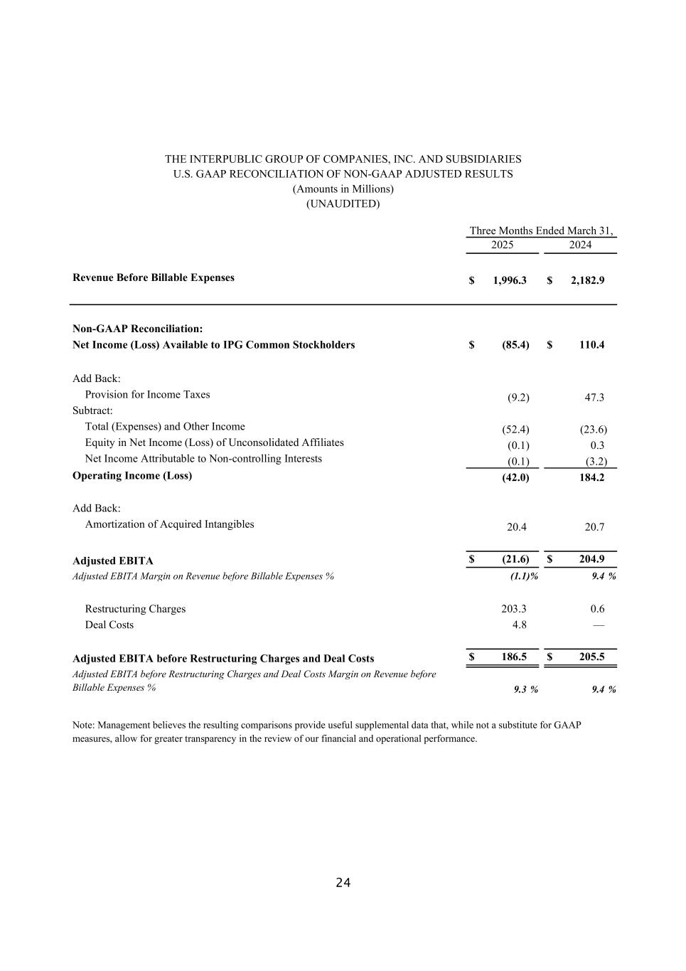 24国际公司集团有限公司。和子公司截至3月31日的三个月非公认会计准则调整后业绩(百万金额)(未经审计)的美国通用会计准则对账,2025年2024年可结算费用前收入1,996.3美元2,18 2.9美元非美国通用会计准则对账:IPG普通股股东可获得的净收入(亏损)$(85.4)$ 110.4加回:所得税准备金(9.2)47.3减:总计(费用)和其他收入(52.4)(23.6)未合并关联公司净收入(亏损)中的权益(0.1)0.3归属于非控股权益的净利润(0.1)(3.2)营业收入(亏损)(42.0)184.2加回:已购无形资产摊销20.42 0.7调整后EBITA $(21.6)$ 204.9调整后EBITA未计可结算费用收入利润率%(1.1)% 9.4%重组费用203.3 0.6交易成本4.8 —调整后EBITA未计重组费用和交易成本$ 186.5 $ 205.5调整后EBITA未计重组费用和交易成本可结算费用前收入利润率% 9.3% 9.4%注:管理层认为,由此产生的比较提供了有用的补充数据,这些数据虽然不能替代GAAP衡量标准,但允许在审查我们的财务和运营业绩时提高透明度。