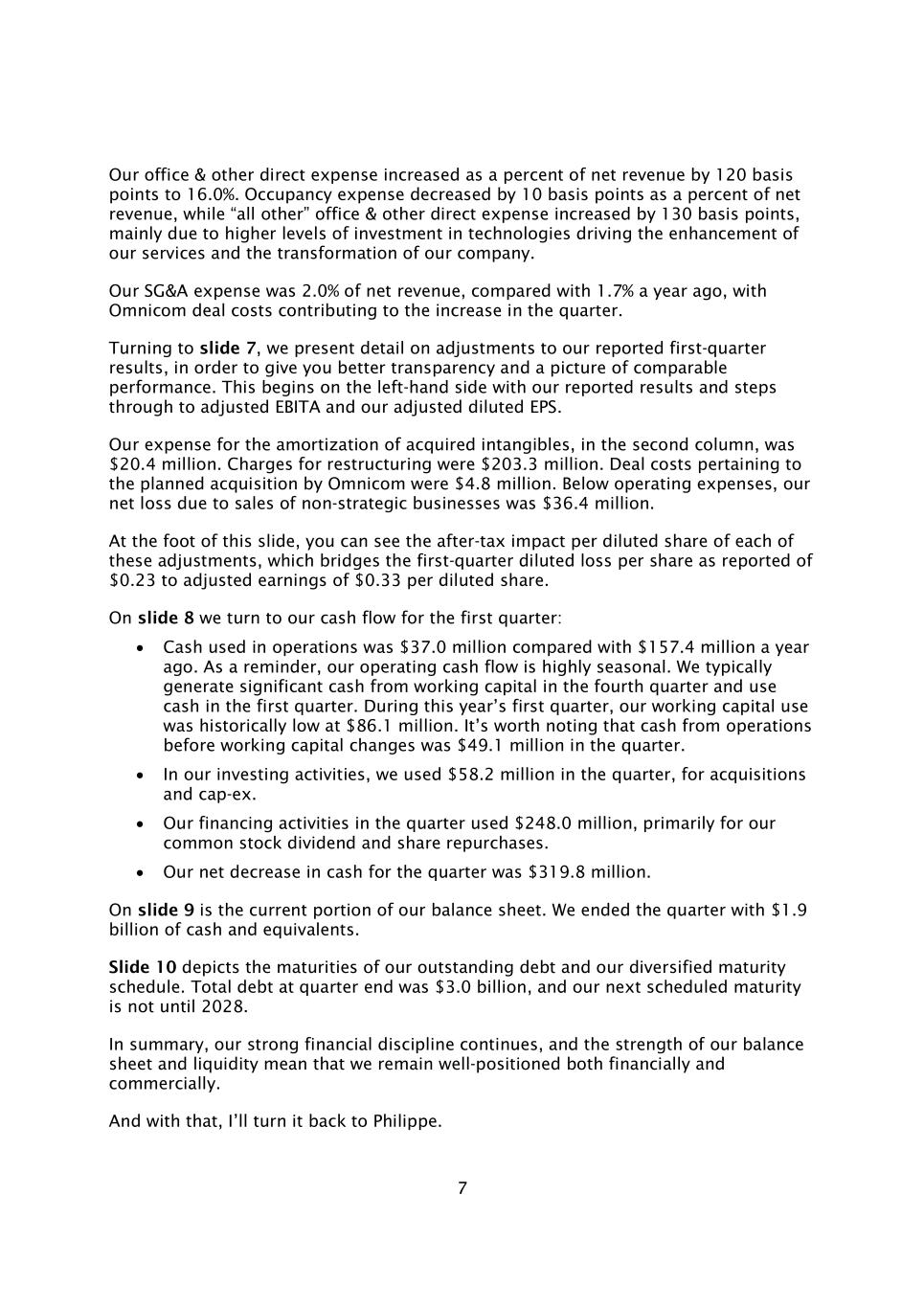 7我们的办公室和其他直接费用占净收入的百分比增加了120个基点,达到16.0%。占用费用占净收入的百分比下降了10个基点,而“所有其他”办公和其他直接费用增加了130个基点,这主要是由于更高水平的技术投资推动了我们服务的增强和公司的转型。我们的SG & A费用为净收入的2.0%,而一年前为1.7%,Omnicom交易成本促成了本季度的增长。转到幻灯片7,我们详细介绍了对我们报告的第一季度业绩的调整,以便为您提供更好的透明度和可比业绩的画面。这从我们报告的结果开始于左侧,并逐步进入调整后的EBITA和调整后的稀释后每股收益。在第二栏中,我们用于摊销收购的无形资产的费用为2040万美元。重组费用为2.033亿美元。与宏盟计划收购相关的交易成本为480万美元。低于运营支出,我们因出售非战略业务而产生的净亏损为3640万美元。在这张幻灯片的脚下,您可以看到每一项调整的每股摊薄税后影响,它将报告的第一季度每股摊薄亏损0.23美元与调整后每股摊薄收益0.33美元联系起来。在幻灯片8上,我们转向第一季度的现金流:运营中使用的现金为3700万美元,而一年前为1.574亿美元。提醒一下,我们的经营现金流具有很强的季节性。我们通常在第四季度从营运资金中产生大量现金,并在第一季度使用现金。在今年第一季度,我们的营运资金使用处于历史低位,为8610万美元。值得注意的是,本季度营运资本变动前的运营现金为4910万美元。在我们的投资活动中,我们在本季度使用了5820万美元,用于收购和资本支出。我们本季度的融资活动使用了2.48亿美元,主要用于我们的普通股股息和股票回购。我们本季度的现金净减少为3.198亿美元。幻灯片9是我们资产负债表的当前部分。我们在本季度末拥有19亿美元的现金和等价物。幻灯片10描述了我们未偿债务的到期情况以及我们多样化的到期时间表。季度末的总债务为30亿美元,我们的下一个预定到期日要到2028年。总之,我们强大的财务纪律仍在继续,我们的资产负债表和流动性的强劲意味着我们在财务和商业上都处于有利地位。有了这个,我会把它转回给菲利普。
