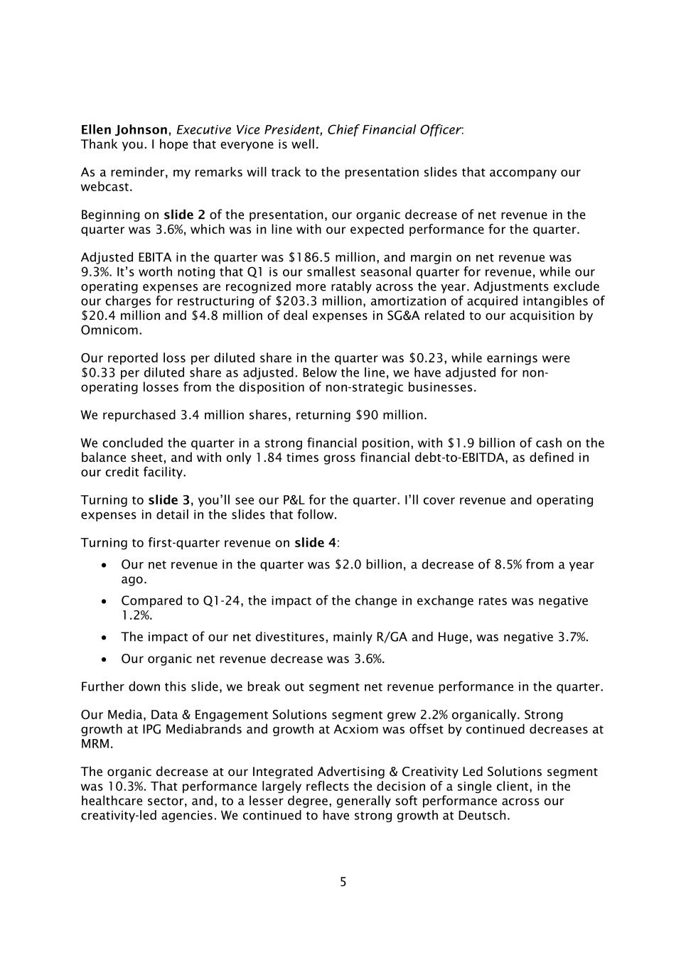 5执行副总裁、首席财务官Ellen Johnson:谢谢。希望大家都好。提醒一下,我的发言将跟踪我们网络直播随附的演示幻灯片。从演示文稿的幻灯片2开始,我们本季度净营收的有机下降为3.6%,这符合我们对本季度的预期业绩。本季度调整后EBITA为1.865亿美元,净营收利润率为9.3%。值得注意的是,第一季度是我们收入最小的季节性季度,而我们的运营费用在全年的确认比例更高。调整不包括我们2.033亿美元的重组费用、2040万美元的收购无形资产摊销以及与我们被Omnicom收购相关的SG & A交易费用480万美元。我们在本季度报告的每股摊薄亏损为0.23美元,而经调整后的每股摊薄收益为0.33美元。线以下,我们调整了非战略性业务处置的非经营性亏损。我们回购了340万股,回报了9000万美元。我们在本季度结束时的财务状况强劲,资产负债表上有19亿美元的现金,金融总债务与EBITDA的比率仅为我们信贷工具中定义的1.84倍。转到幻灯片3,您将看到我们本季度的损益表。我将在接下来的幻灯片中详细介绍收入和运营费用。转到幻灯片4上的第一季度营收:本季度我们的净营收为20亿美元,比去年同期下降8.5%。与Q1-24相比,汇率变动的影响为负1.2%。我们的净资产剥离,主要是R/GA和Huge的影响为负3.7%。我们的有机净收入减少了3.6%。在这张幻灯片的更下方,我们细分了本季度的部门净收入表现。我们的媒体、数据和参与解决方案部门有机增长2.2%。IPG Mediabrands的强劲增长和安客诚的增长被MRM的持续下降所抵消。我们的综合广告和创意LED解决方案部门的有机下降为10.3%。这一表现在很大程度上反映了单一客户的决定,在医疗保健领域,在较小程度上,反映了我们以创意为主导的机构普遍表现疲软。我们在Deutsch继续保持强劲增长。