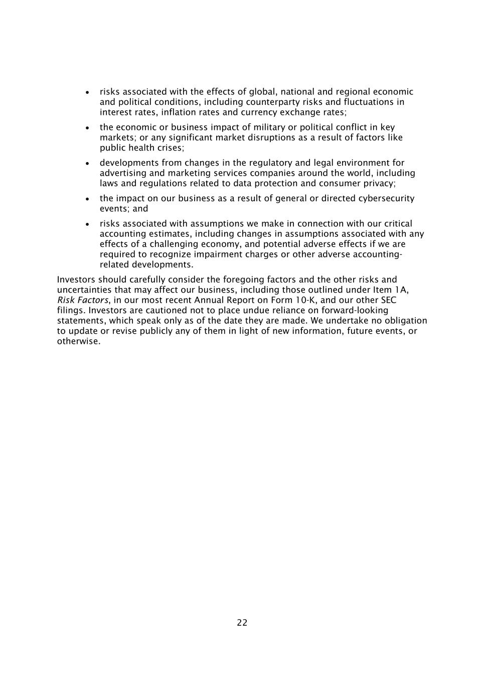 22与全球、国家和区域经济和政治状况影响相关的风险,包括交易对手风险以及利率、通货膨胀率和货币汇率的波动;关键市场的军事或政治冲突的经济或商业影响;或公共卫生危机等因素导致的任何重大市场中断;世界各地广告和营销服务公司的监管和法律环境变化带来的发展,包括与数据保护和消费者隐私相关的法律法规;一般或定向网络安全事件对我们业务的影响;以及与我们就关键会计估计做出的假设相关的风险,包括与具有挑战性的经济的任何影响相关的假设变化,以及如果我们被要求确认减值费用或其他与会计相关的不利发展,则可能产生的不利影响。投资者应仔细考虑上述因素以及可能影响我们业务的其他风险和不确定性,包括我们最近的10-K表格年度报告以及我们提交给SEC的其他文件中第1A项风险因素中概述的风险和不确定性。投资者被告诫不要过分依赖前瞻性陈述,这些陈述仅在作出之日起生效。我们不承担根据新信息、未来事件或其他情况公开更新或修改其中任何一项的义务。