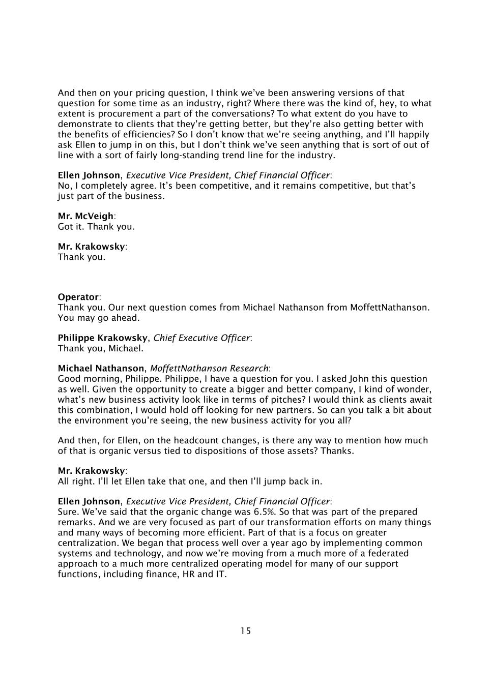 15然后关于你的定价问题,我认为作为一个行业,我们已经回答这个问题的版本有一段时间了,对吗?哪里有那种,哎,采购到什么程度才是对话的一部分?你必须在多大程度上向客户证明他们正在变得更好,但他们也在利用效率带来的好处变得更好?所以我不知道我们看到了什么,我会很高兴地要求Ellen加入这件事,但我认为我们没有看到任何与该行业相当长期的趋势线不相符的东西。执行副总裁、首席财务官Ellen Johnson:不,我完全同意。它一直具有竞争力,而且仍然具有竞争力,但这只是业务的一部分。麦克维先生:明白了。谢谢你。克拉科夫斯基先生:谢谢。接线员:谢谢。我们的下一个问题来自MoffettNathanson的Michael Nathanson。你可以先走了。首席执行官Philippe Krakowsky:谢谢你,Michael。Michael Nathanson,MoffettNathanson研究:早上好,Philippe。菲利普,我有一个问题要问你。我也问了约翰这个问题。如果有机会创建一个更大更好的公司,我有点想知道,就球场而言,新的商业活动是什么样的?我认为,当客户在等待这种组合时,我会推迟寻找新的合作伙伴。那么能不能给大家谈一下你们所看到的环境,新的商业活动呢?然后,对于Ellen来说,关于员工人数的变化,有没有办法提到其中有多少是有机的,而不是与这些资产的处置有关?谢谢。克拉科夫斯基先生:好的。我会让埃伦拿那个,然后我会跳回去。执行副总裁、首席财务官:您好,Ellen Johnson:当然可以。我们说过有机变化是6.5%。所以这是准备好的评论的一部分。作为我们转型努力的一部分,我们非常专注于许多事情和提高效率的许多方式。其中一部分是关注更大程度的集中化。一年多前,我们通过实施通用系统和技术开始了这一过程,现在我们正在从一种更加联合的方法转变为对我们的许多支持职能(包括财务、人力资源和IT)更加集中的运营模式。