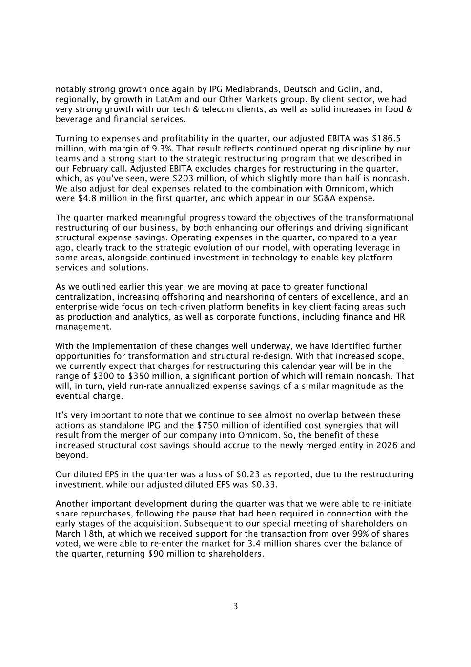 3 IPG Mediabrands、Deutsch和Golin再次实现了显着的强劲增长,而在区域方面,拉丁美洲和我们的其他市场组的增长也再次实现了显着的强劲增长。按客户部门划分,我们的科技和电信客户实现了非常强劲的增长,食品饮料和金融服务也实现了稳健增长。转向本季度的费用和盈利能力,我们的调整后EBITA为1.865亿美元,利润率为9.3%。这一结果反映了我们团队持续的运营纪律,以及我们在2月份电话会议中描述的战略重组计划的强劲开端。调整后的EBITA不包括本季度的重组费用,正如你所看到的,重组费用为2.03亿美元,其中略超过一半为非现金。我们还调整了与Omnicom合并相关的交易费用,第一季度为480万美元,这些费用出现在我们的SG & A费用中。本季度标志着我们在实现业务转型重组目标方面取得了有意义的进展,既增强了我们的产品,又推动了显着的结构性费用节约。与一年前相比,本季度的运营费用显然与我们模式的战略演变保持一致,在某些领域具有运营杠杆,同时继续投资于技术以实现关键平台服务和解决方案。正如我们在今年早些时候概述的那样,我们正在加快推进更大的职能集中化,增加卓越中心的离岸外包和近岸外包,并在整个企业范围内关注生产和分析等面向客户的关键领域以及包括财务和人力资源管理在内的企业职能领域的技术驱动平台效益。随着这些变革的顺利实施,我们发现了进一步的转型和结构重新设计机会。随着这一范围的扩大,我们目前预计,本日历年的重组费用将在300至3.5亿美元之间,其中很大一部分仍将是非现金的。反过来,这将产生与最终费用类似幅度的运行率年化费用节省。非常重要的是要注意到,我们仍然看到,作为独立的IPG,这些行动与我们公司并入Omnicom将产生的7.5亿美元已确定的成本协同效应之间几乎没有重叠。因此,这些增加的结构性成本节约的好处应该会在2026年及以后为新合并的实体带来。由于重组投资,我们在本季度的稀释后每股收益为亏损0.23美元,而我们调整后的稀释后每股收益为0.33美元。本季度的另一个重要进展是,我们能够重新启动股票回购,此前在收购的早期阶段需要暂停。在我们于3月18日举行的特别股东大会上,我们获得了超过99%的股票投票支持该交易后,我们得以在本季度的剩余时间内以340万股的价格重新进入市场,为股东带来了9000万美元的回报。