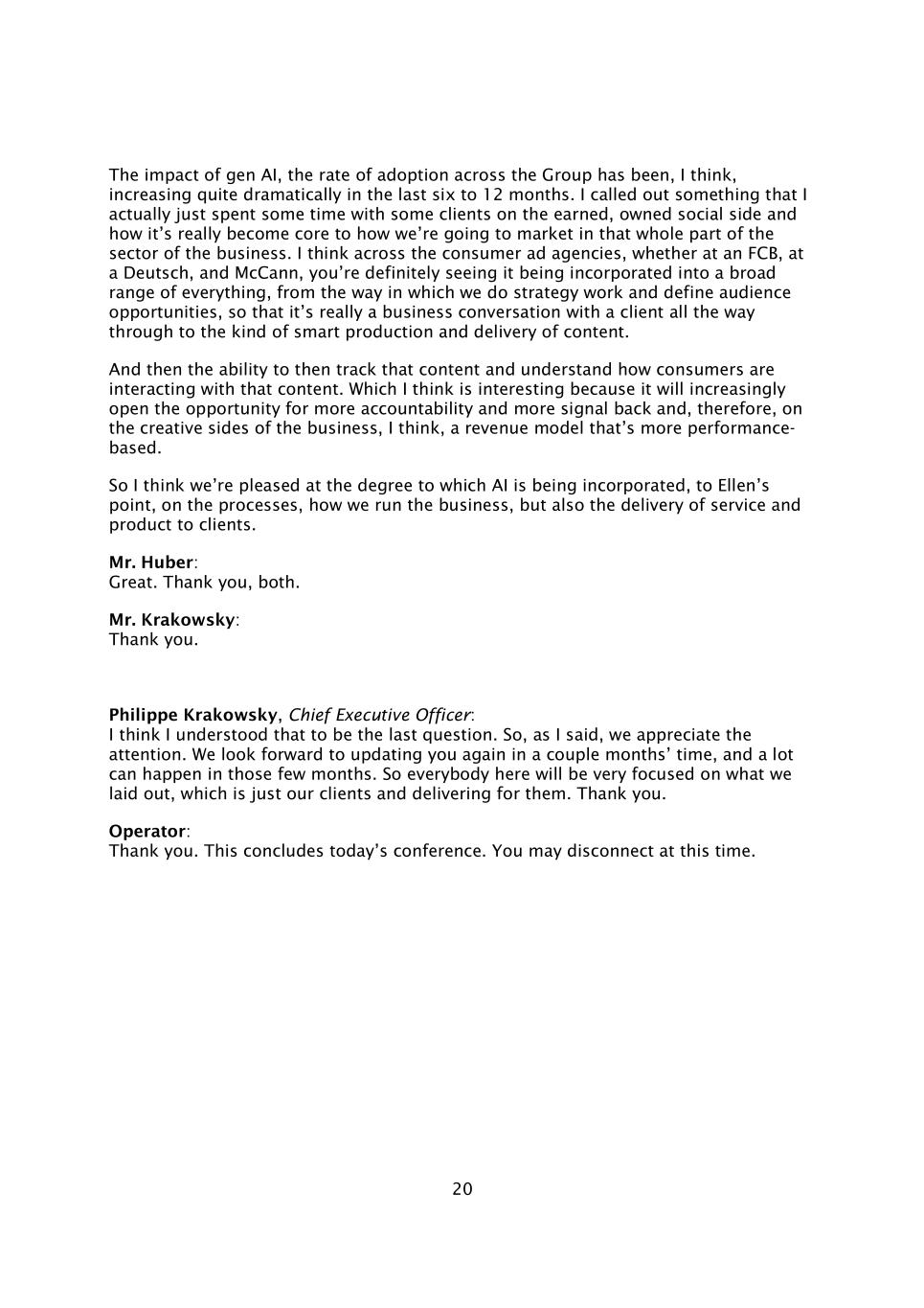 20 GEN AI的影响,我认为,在过去的6到12个月里,整个集团的采用率一直在显着增加。我提到了一些事情,实际上我只是在赚取的、拥有的社交方面与一些客户花了一些时间,以及它如何真正成为我们如何在整个业务部门进行营销的核心。我认为,在消费者广告代理机构中,无论是在FCB、在Deutsch还是在McCann,你肯定会看到它被纳入了广泛的所有领域,从我们做战略工作和定义受众机会的方式,因此它实际上是与客户的商业对话,一直到内容的智能制作和交付。然后跟踪该内容并了解消费者如何与该内容互动的能力。我认为这很有趣,因为它将越来越多地为更多的问责制和更多的信号反馈打开机会,因此,在业务的创造性方面,我认为,这是一种更基于绩效的收入模式。因此,我认为我们对人工智能被纳入的程度感到满意,就艾伦的观点而言,在流程、我们如何经营业务以及向客户提供服务和产品方面。胡贝尔先生:太好了。谢谢,两位。克拉科夫斯基先生:谢谢。首席执行官Philippe Krakowsky:我想我明白这是最后一个问题。因此,正如我所说,我们感谢大家的关注。我们期待在几个月后再次更新您,这几个月可以发生很多事情。所以在座的每个人都会非常专注于我们布局的东西,这只是我们的客户并为他们交付。谢谢。接线员:谢谢。今天的会议到此结束。这个时候可以断开连接了。
