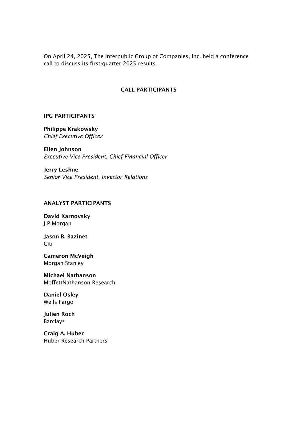 2025年4月24日,Interpublic Group of Companies,Inc.召开电话会议,讨论2025年第一季度业绩。Call Participants IPG Participants Philippe KrakowskyTERM1首席执行官Ellen Johnson执行副总裁、首席财务官 Jerry Leshne高级副总裁、投资者关系分析师Participants David Karnovsky J.P.Morgan Jason B. Bazinet Citi Cameron McVeigh 摩根士丹利 Michael Nathanson丨MoffettNathanson MoffettNathansonTERM5 Research Daniel Osley丨Wells Fargo 富国银行丨Julien Roch 巴克莱银行 Craig A. Huber Huber Research Partners