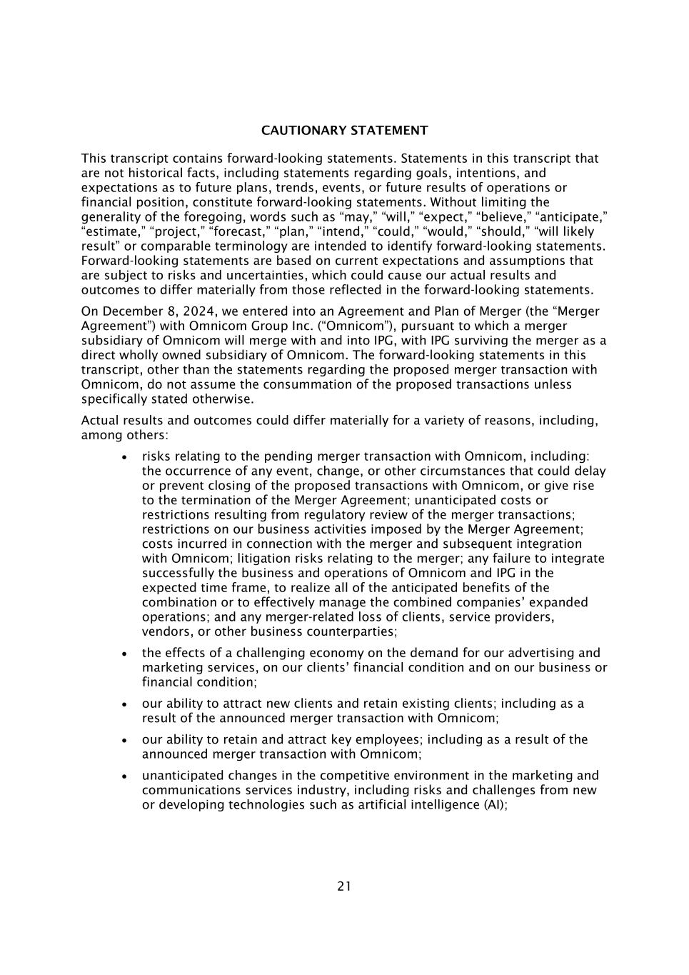 21警示性声明这份成绩单包含前瞻性声明。本成绩单中非历史事实的陈述,包括关于目标、意图和对未来计划、趋势、事件或未来运营结果或财务状况的预期的陈述,构成前瞻性陈述。在不限制前述内容的一般性的情况下,诸如“可能”、“将”、“预期”、“相信”、“预期”、“估计”、“项目”、“预测”、“计划”、“打算”、“可能”、“将”、“应该”、“将可能导致”或类似术语旨在识别前瞻性陈述。前瞻性陈述基于当前的预期和假设,这些预期和假设受到风险和不确定性的影响,这可能导致我们的实际结果和结果与前瞻性陈述中反映的结果和结果存在重大差异。于2024年12月8日,我们与宏盟集团(“Omnicom”)订立合并协议及计划(“合并协议”),据此,Omnicom的合并附属公司将与IPG合并,而IPG作为Omnicom的直接全资附属公司在合并中幸存下来。这份成绩单中的前瞻性陈述,除了关于与宏盟的拟议合并交易的陈述外,并不假设拟议交易的完成,除非另有特别说明。由于多种原因,实际结果和结果可能存在重大差异,其中包括:与Omnicom的未决合并交易相关的风险,包括:可能会延迟或阻止与Omnicom的拟议交易完成的任何事件、变化或其他情况的发生,或导致合并协议终止;因监管机构对合并交易的审查而产生的意外成本或限制;合并协议对我们的业务活动施加的限制;与合并以及随后与宏盟的整合相关的成本;与合并有关的诉讼风险;未能在预期时间范围内成功整合宏盟和IPG的业务和运营,以实现合并的所有预期收益或有效管理合并后公司的扩大运营;以及与合并相关的客户、服务提供商、供应商、或其他业务对手方;充满挑战的经济对我们的广告和营销服务需求、对我们客户的财务状况以及对我们的业务或财务状况的影响;我们吸引新客户和留住现有客户的能力;包括由于宣布与宏盟的合并交易;我们留住和吸引关键员工的能力;包括由于宣布与宏盟的合并交易;营销和通信服务行业竞争环境的意外变化,包括来自人工智能(AI)等新技术或发展中技术的风险和挑战;