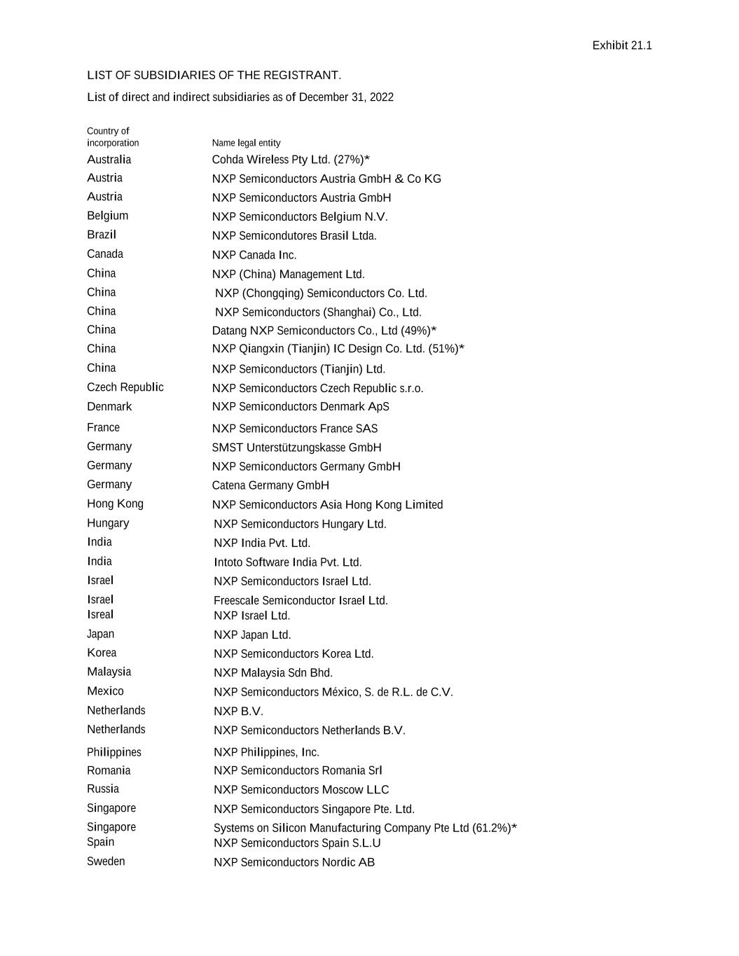 附件 21.1注册人的附属公司名单。截至2022年12月31日的直接和间接子公司名单注册国家名称法人澳大利亚Cohda Wireless Pty Ltd.(27%)*奥地利恩智浦半导体 Austria GmbH & Co KG Austria 恩智浦半导体 Belgium N.V.巴西NXP Semiconductors Brasil Ltda。加拿大恩智浦加拿大公司中国恩智浦(中国)管理有限公司中国恩智浦(重庆)半导体有限公司中国恩智浦半导体(上海)有限公司中国大唐恩智浦半导体半导体有限公司,Ltd(49%)*中国恩智浦强芯(天津)集成电路设计有限公司(51%)*中国恩智浦半导体(天津)有限公司捷克共和国恩智浦半导体捷克共和国s.r.o.丹麦恩智浦半导体丹麦ApS法国恩智浦半导体 France SAS Germany SMST Unterst ü tzungskasse GmbH Germany 恩智浦半导体 Germany GmbH Germany Catena Germany GmbH Hong Kong NXP Semiconductors 恩智浦半导体丨Asia Hong Kong Limited匈牙利恩智浦半导体 Hungary Ltd. India NXP India Pvt. Ltd. India Intoto Software India Pvt. Ltd. Israel 恩智浦半导体 Israel Ltd. Israel丨Freescale Semiconductor墨西哥恩智浦半导体 M é xico,S. de R.L. de C.V.荷兰NXP B.V.荷兰恩智浦半导体 Netherlands B.V.菲律宾NXP Philippines,Inc.罗马尼亚TERM0 NXP Semiconductors 恩智浦半导体罗马尼亚SRL俄罗斯恩智浦半导体TERM3 Moscow LLC Singapore TERM0 NXP Semiconductors 恩智浦半导体 Singapore Pte. Ltd. Singapore Systems on Silicon Manufacturing Company Pte Ltd(61.2%)*西班牙恩智浦半导体 Spain S.L.U Sweden 恩智浦半导体 Nordic AB