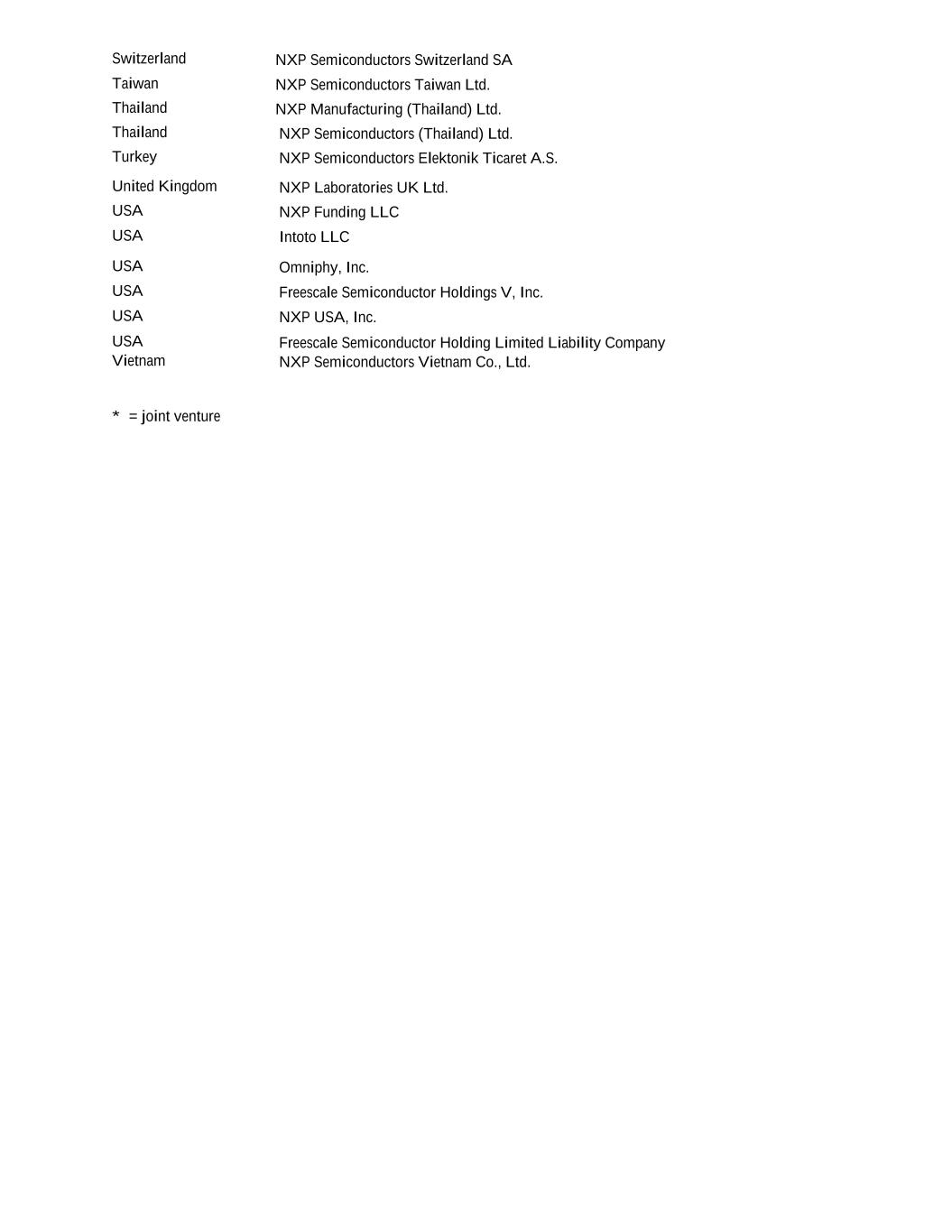 瑞士恩智浦半导体 Switzerland SA Taiwan TERM0恩智浦半导体 Taiwan Ltd. Thailand NXP Manufacturing(Thailand)Ltd. Thailand 恩智浦半导体TERM2(Thailand)Ltd. Turkey NXP Semiconductors 恩智浦半导体 Elektonik Ticaret A.S. United Kingdom NXP Laboratories UK Ltd. USA NXP Funding LLC USA Intoto LLC USA Omniphy,Inc. USA TERM0 Holdings V,Inc. USA NXP USA,Inc. USA TERM0 Freescale Semiconductor 飞思卡尔 Holding Limited Liability Company Vietnam TERM0 NXP Semiconductors 恩智浦半导体 Vietnam Co.,Ltd. * =合资企业