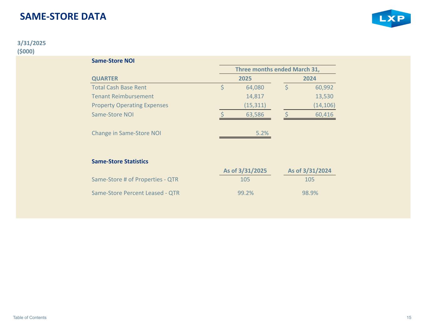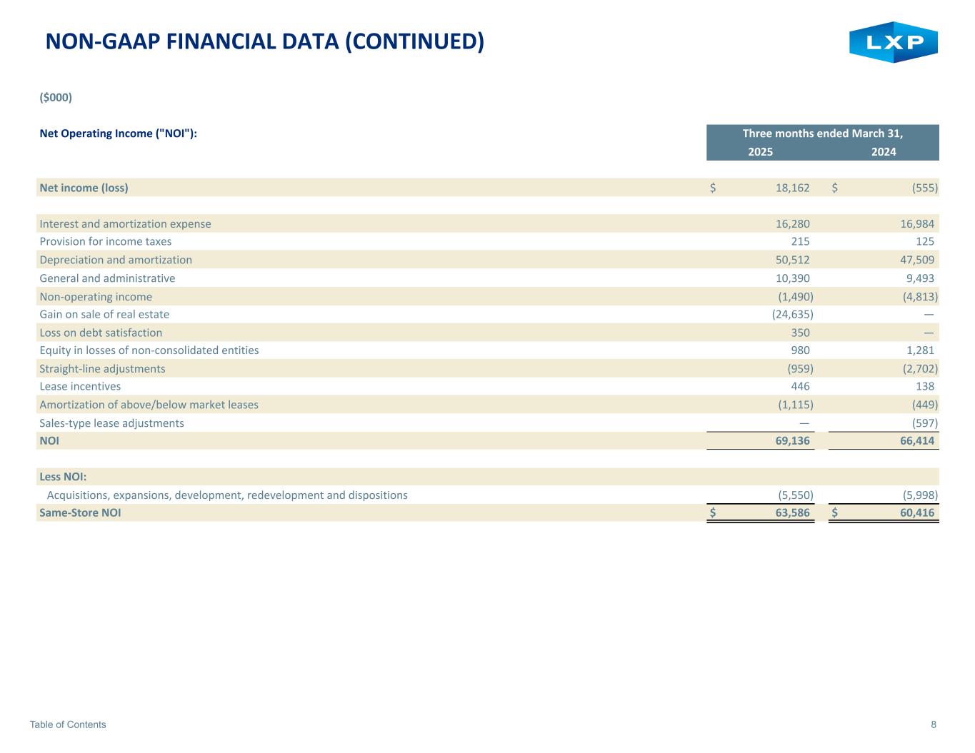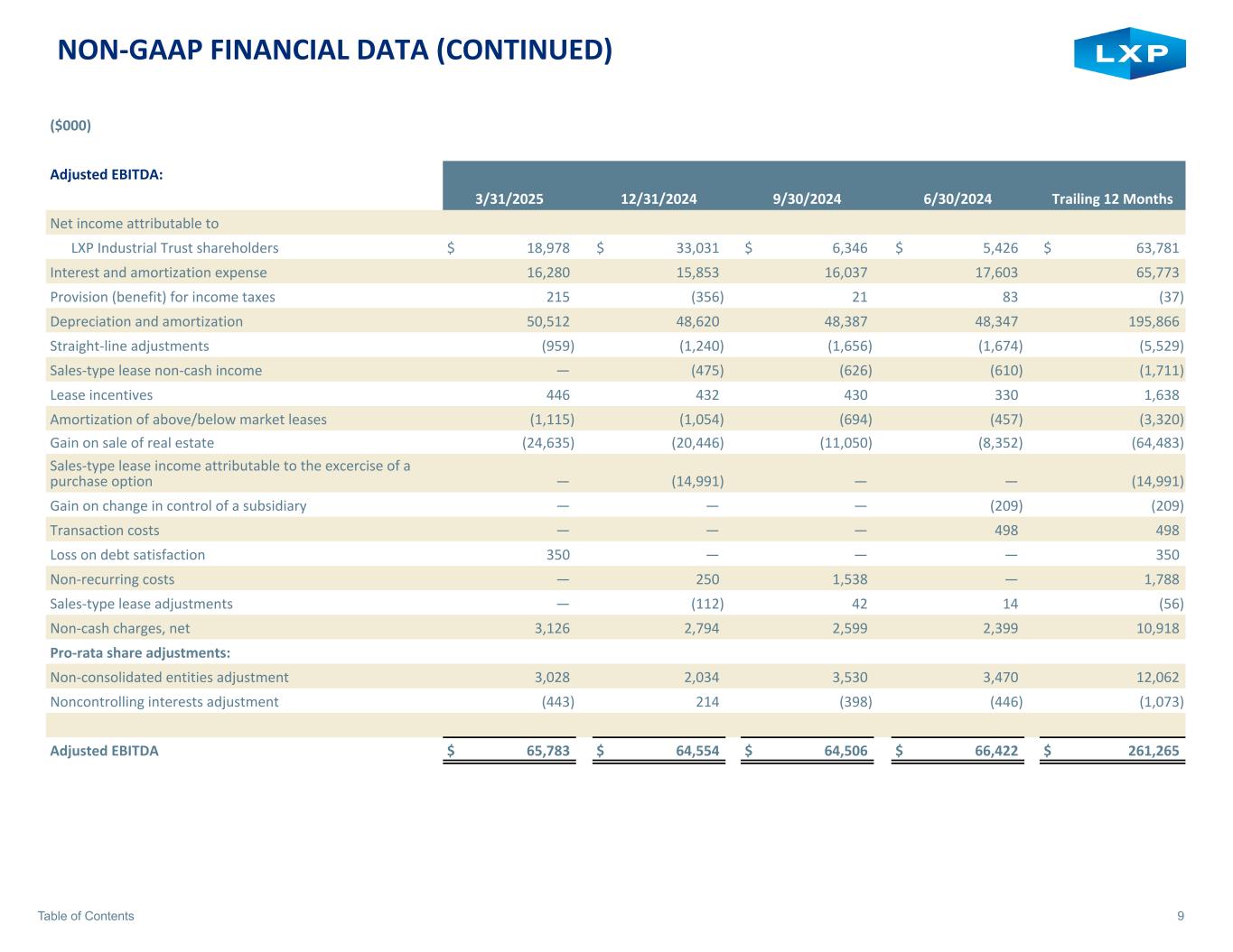 8目录NON-GAAP财务数据(续)(000美元)净营业收入(“NOI”):截至3月31日的三个月,20252024净收入(亏损)$ 18,162 $(555)利息和摊销费用16,28016,984所得税准备金215125折旧和摊销50,51247,509一般和行政费用10,3909,493营业外收入(1,490)(4,813)出售房地产收益(24,635)—债务清偿损失350 —非合并实体损失中的权益9801,281直线调整(959)(2,702)租赁奖励446138高于/低于市场租赁的摊销(1,115)(449)销售型租赁调整——(597)NOI 69,13666,414减NOI:收购、扩建、开发、再开发和处置(5,550)(5,998)同店NOI 63,586美元60,416美元