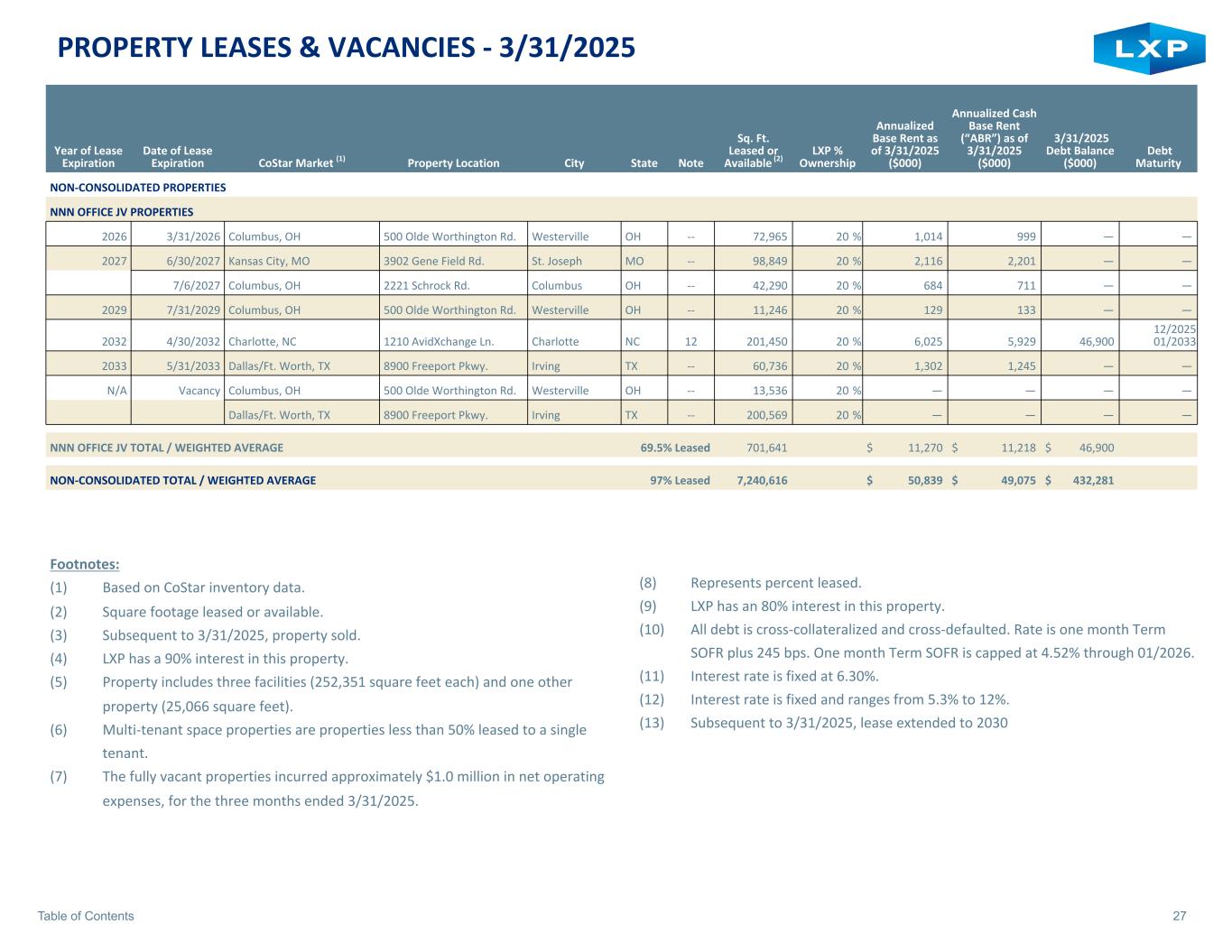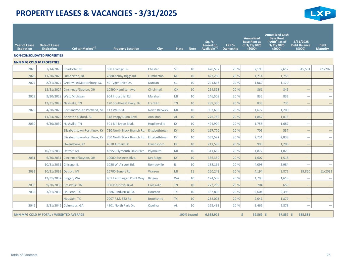 26目录物业租赁&空缺-3/31/2025租约年份到期日租约到期CoStar Market(1)物业位置City State Note Sq。英尺。租赁或可用(2)LXP %所有权截至2025年3月31日的年化基础租金(000美元)截至2025年3月31日的年化现金基础租金(“ABR”)(000美元)3/31/2025债务余额(000美元)债务到期日非合并财产↓ NNN 丨MFGTERM2 COLD JV Properties 20257/14/2025 Charlotte,NC 590 Ecology Ln。切斯特SC 10420,59720% 2,1902,617345,53101/2026202611/30/2026 Lumberton,NC 2880 Kenny Biggs Rd. Lumberton NC 10423,28020% 1,7141,755 —— 2027年8月31日/2027 Greenville/Spartanburg,SC 50 Tyger River Dr. Duncan SC 10221,83320% 1,0621,170 —— 12/31/2027 Cincinnati/Dayton,OH 10590 Hamilton Ave. Cincinnati OH 10264,59820% 861845 —— 20289/30/2028 West Michigan 904 Industrial Rd. Marshall MI 10246,50820% 835833 —— 12/31/2028 Nashville,TN 120 Southeast PKWY富兰克林博士TN 10289,33020% 833735 —— 2029 4/30/2029 Portland/South Portland,ME 113 Wells St. North Berwick ME 10993,68520% 1,6721,200 —— 11/24/2029 Anniston-Oxford,AL 318 Pappy Dunn Blvd. Anniston AL 10276,78220% 1,8421,815 —— 20306/30/2030 Nashville,TN 301 Bill Bryan Blvd. Hopkinsville KY 10424,90420% 1,7551,687 —— Elizabeth Town-Fort Knox,KY 730 North Black Branch Rd. Elizabeth TownKY 10167,77020% 709537 —— Elizabeth Town-Fort Knox,KY 750 North Black Branch Rd. Elizabeth Town KY 10539,59220% 2,7312,838 —— Owensboro,KY 4010 Airpark Dr. Owensboro KY 10211,59820% 9901,208 —— 10/31/2030 Detroit,MI 43955 Plymouth Oaks Blvd. Plymouth MI 10311,61220% 1,8721,823 —— 20316/30/2031 Cincinnati/Dayton,OH 10000 Business Blvd. Dry Ridge KY 10336,35020% 1,6071,518 —— 10/31/2031 Chicago,IL 1020 W. Airport Rd. Romeoville IL 10188,16620% 4,0983,984 —— 203210/31/20MI 26700 Bunert Rd. Warren MI 11260,24320% 4,1943,87239,85011/203212/31/2032 Bingen,WA 901 East Bingen Point Way Bingen WA 10124,53920% 1,7901,618 —— 20339/30/2033 Crossville,TN 900 Industrial Blvd. Crossville TN 10222,20020% 704650 —— 20353/31/2035 Houston,TX 13863 Industrial Rd. Houston TX 10187,80020% 2,6042,395 —— Houston,TX 7007 F.M. 362 Rd. Brookshire TX 10262,09520% 2,0411,879 —— 20425/31/2042 Columbus,GA 4801 North Park Dr. Opelika AL 10165,49320% 3,4652,878 —— NNNMFG COLD JV Total/weighted average 100% leased 6,538,975 $ 39,569 $ 37,857 $ 385,381
