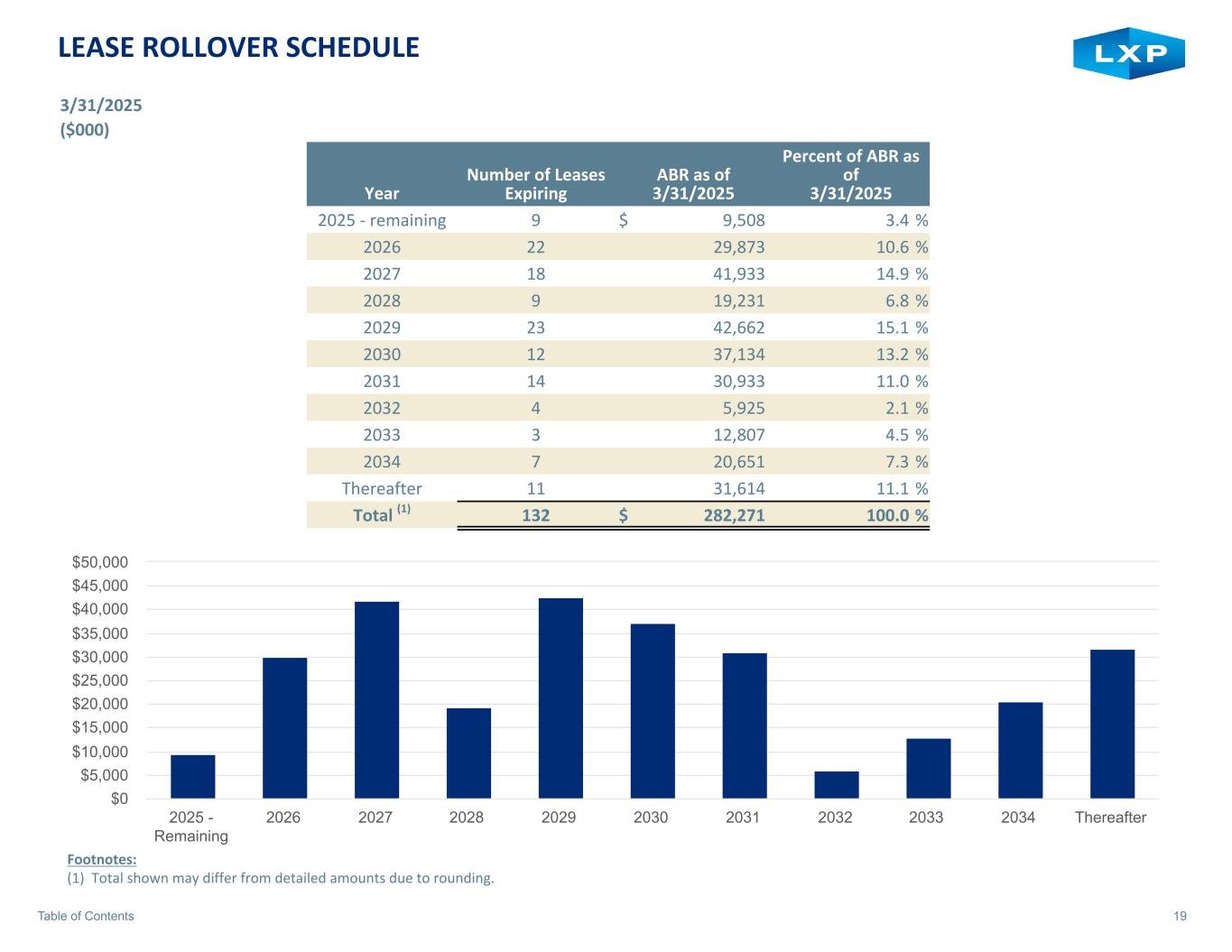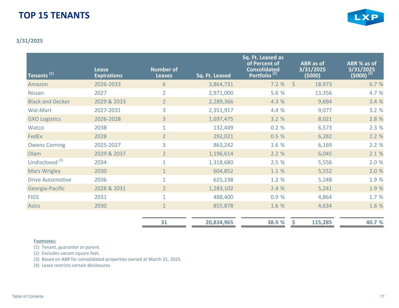 17目录TOP 15租户3/31/2025租户(1)租约到期租赁数量sq。英尺。租赁的SQ。英尺。租赁占合并投资组合的百分比(2)ABR截至2025年3月31日(000美元)ABR %截至2025年3月31日(000美元)(3)亚马逊2026-2033 63,864,7317.2% $ 18,9736.7%日产202722,971,0005.6% 13,3564.7%黑色和Decker 2029 & 203322,289,3664.3% 9,6943.4%沃尔玛2027-2031 32,351,9174.4% 9,0773.2% GXO Logistics 2026-2028 31,697,4753.2% 8,0 212.8% Watco 20381132,4490.2% 6,573 2.3% FedEx 20282292,0210.5% 6,2822.2% 欧文斯科宁 2025-2027 3863,2421.6% 6,1692.2% Olam 2029 & 203721,196,6142.2% 6,0452.1%未披露(4)203411,318,6802.5% 5,5562.0% Mars Wrigley 20301604,8521.1% 5,5522.0% Drive Automotive 20361625,2381.2% 5,2481.9%Georgia-Pacific 2028 & 203121,283,1022.4% 5,2411.9% FIGS 20311488,4000.9% 4,8641.7% Asics 20301855,8781.6% 4,6341.6% 3120,834,96538.9% $ 115,28540.7%脚注:(1)租户、担保人或母公司。(2)不包括空置平方英尺。(3)基于于2025年3月31日拥有的综合物业的ABR。(4)租赁限制某些披露。