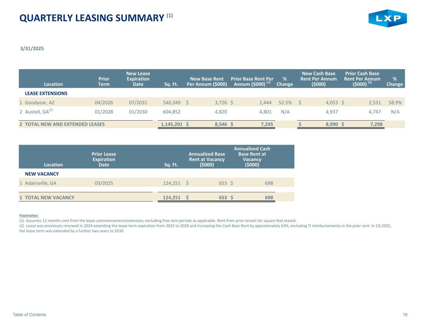 18目录季度租赁概要(1)3/31/2025地点前期新租约到期日 SQ。英尺。新基本年租金(000美元)先前基本年租金(000美元)(1)%变化新现金基础年租金(000美元)先前现金基础年租金(000美元)(1)%变化租赁延期1固特异,AZ 04/202607/2031540,349 $ 3,726 $ 2,44452.5% $ 4,053 $ 2,551589.9% 2 Austell,GA(2)01/202801/2030604,8524,8204,801 N/A 4,9374,747 N/A 2新的和延长的租赁总额1,145,201美元8,546美元7,245美元8,990美元7,298美元7,298美元7,990美元7,298美元7,990美元7,990美元7,990美元7,990美元英尺。年度化空置基础租金(000美元)年度化空置现金基础租金(000美元)新空缺1 Adairsville,GA 03/2025124,251 $ 653 $ 6981总新空缺124,251 $ 653 $ 698脚注:(1)假设自租约开始/延期起12个月的租金,不包括适用的免费租期。向先前租户出租的平方英尺租金。(2)此前于2024年续租,将租期从2025年延长至2028年,并将现金基础租金增加约63%,不包括先前租金中的TI报销。2025年第一季度,租期再延长两年至2030年。