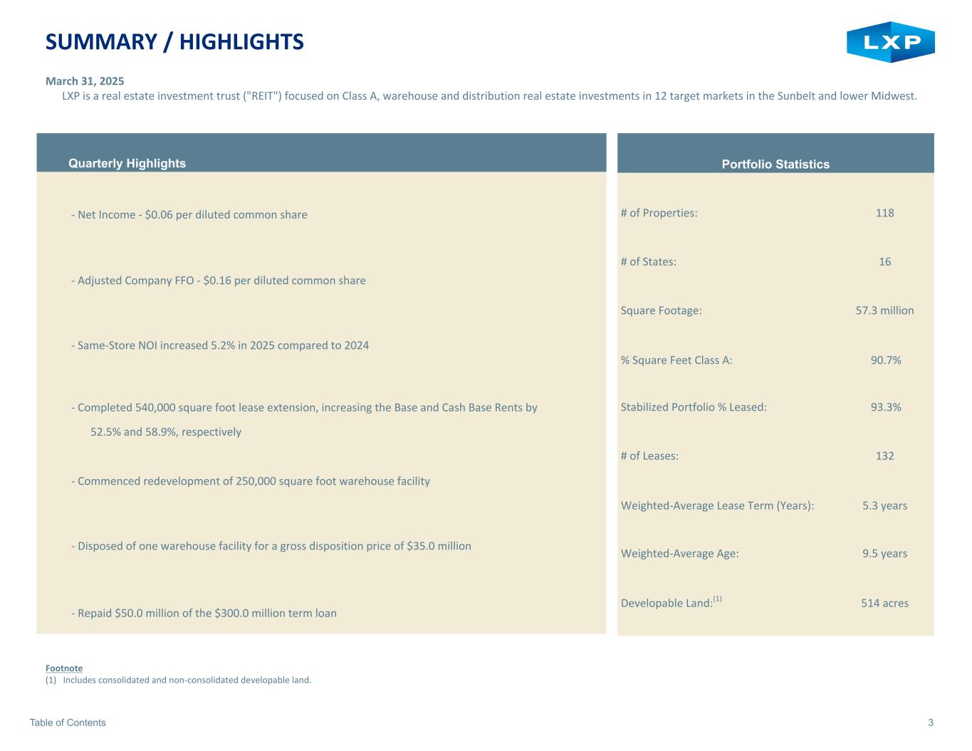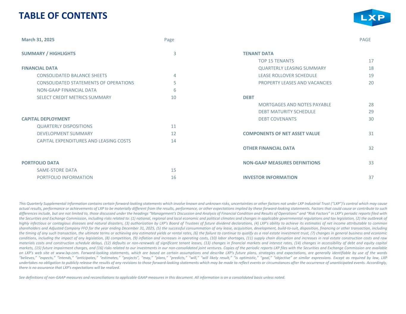 目录3月31日,2025年页摘要/要点3租户数据TOP15租户17财务数据季度租赁摘要18合并资产负债表4租赁展期时间表19合并经营报表5物业租赁和空缺20非公认会计准则财务数据6选择信贷指标摘要10债务抵押和应付票据28债务到期时间表29资本部署债务补充信息包含某些前瞻性陈述,其中涉及已知和未知的风险、不确定性或其他不在LXP Industrial Trust(“LXP”)控制下的因素,这些因素可能导致LXP的实际结果、业绩或成就与这些前瞻性陈述所暗示的结果、业绩或其他预期存在重大差异。可能导致或促成此类差异的因素包括但不限于LXP向美国证券交易委员会提交的定期报告中“管理层对财务状况和经营成果的讨论和分析”和“风险因素”标题下讨论的因素,包括与以下相关的风险:(1)国家、地区和地方的经济和政治气候以及适用的政府法规和税法的变化,(2)爆发高度传染性或传染性疾病和自然灾害,(3)LXP董事会对未来股息申报的授权,(4)LXP实现其截至2025年12月31日止年度归属于普通股股东的净利润和调整后公司FFO估计的能力,(5)成功完成任何租赁、收购、开发、定制、处置、融资或其他交易,包括任何此类交易的时间安排、最终条款或实现任何估计收益率或出租率,(6)未能继续符合房地产投资信托的资格,(7)一般商业和经济状况的变化,包括任何立法的影响,(8)竞争,(9)通货膨胀和运营成本增加,(10)劳动力短缺,(11)供应链中断和房地产建设成本和原材料成本增加以及施工进度延迟,(12)重大租户租约违约或不续签,(13)金融市场和利率的变化,(14)债务和股权资本市场准入的变化,(15)未来减值费用,以及(16)与我们对非合并合资企业的投资相关的风险。向美国证券交易委员会提交的定期报告LXP文件的副本可在LXP的网站www.lxp.com上查阅。前瞻性陈述基于某些假设,描述LXP的未来计划、战略和预期,通常可以通过使用“相信”、“预期”、“打算”、“预期”、“估计”、“项目”、“可能”、“计划”、“预测”、“将”、“将可能导致”、“乐观”、“目标”或类似表达方式来识别。除法律要求外,LXP不承担公开发布可能为反映意外事件发生后的事件或情况而对这些前瞻性陈述进行的任何修订的结果的义务。因此,无法保证LXP的预期一定会实现。请参阅本文件中非GAAP措施的定义以及与适用的GAAP措施的对账。除非另有说明,所有信息均为综合信息。