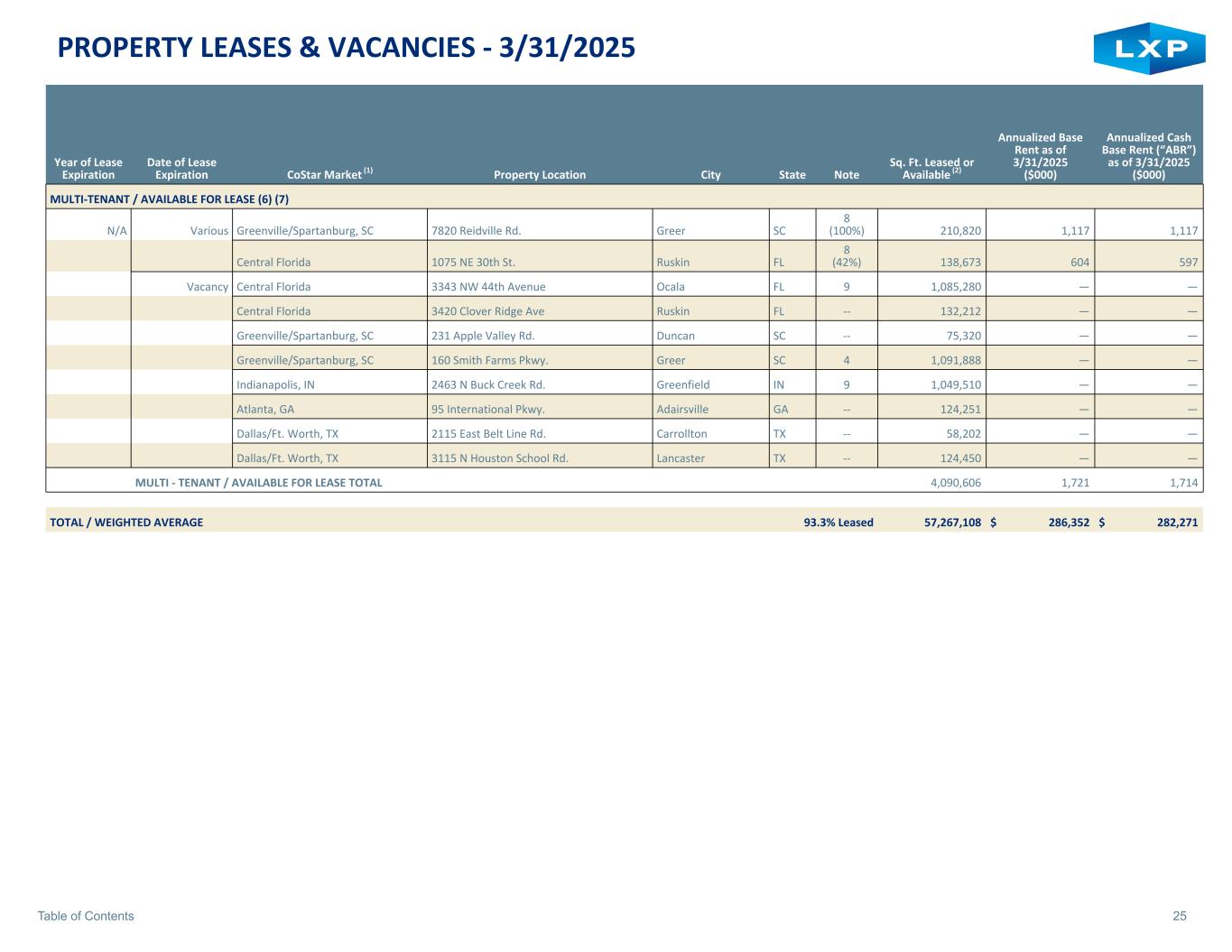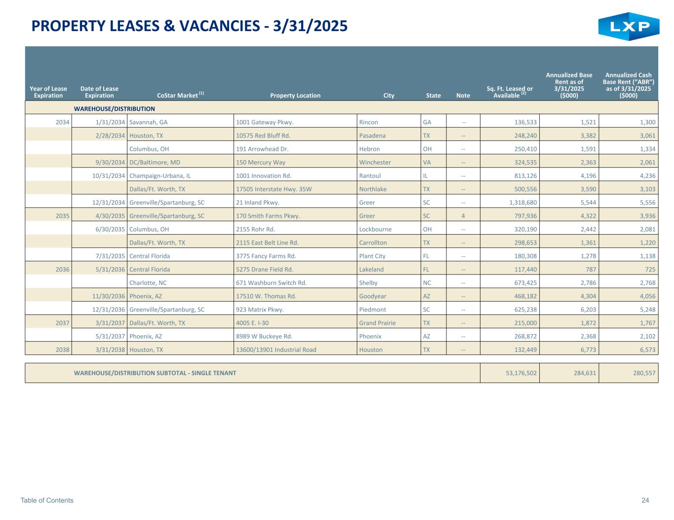 24目录物业租赁&空缺-3/31/2025租约年份到期日租约到期CoStar Market(1)物业位置City State Note Sq。英尺。租赁或可用(2)截至2025年3月31日的年化基础租金(000美元)截至2025年3月31日的年化现金基础租金(“ABR”)(000美元)仓库/分配2034 1/31/2034 Savannah,GA 1001 Gateway PKWY。Rincon GA--136,5331,5211,3002/28/2034 Houston,TX 10575 Red Bluff Rd. Pasadena TX--248,2403,3823,061 Columbus,OH 191 Arrowhead 1,5911,3349/30/2034 DC/Baltimore,MD 150 Mercury Way Winchester VA--324,5352,3632,06110/31/2034 Champaign-Urbana,IL 1001 Innovation Rd. Rantoul IL--813,1264,1964,236 Dallas/ft. Worth,TX 17505 Interstate Hwy。35W Northlake TX--500,5563,5903,10312/31/2034 Greenville/Spartanburg,SC 21 Inland PKWY。Greer SC--1,318,6805,5445,55620354/30/2035 Greenville/Spartanburg,SC 170 Smith Farms PKWY。Greer SC 4797,9364,3223,9366/30/2035 Columbus,OH 2155 Rohr Rd. Lockbourne OH--320,1902,4422,081 Dallas/ft. Worth,TX 2115 East Belt Line Rd. Carrollton TX--298,6531,611,2207/31/2035 Central Florida 3775 Fancy Farms Rd. Plant City FL--180,3081,2781,13820365/31/2036 Central Florida 5275 Drane Field Rd. Lakeland FL--117,440787725 Charlotte,NC 671 Washburn Switch Rd. Shelby NC--673,4252,7862,76811/30/2036Piedmont SC--625,2386,2035,24820373/31/2037 Dallas/ft. Worth,TX 4005 E. I-30 Grand Prairie TX--215,0001,8721,721,767 5/31/2037 Phoenix,AZ 8989 W Buckeye Rd. Phoenix AZ--268,8722,3682,1022038 3/31/2038 Houston,TX 13600/13901 Industrial Road Houston TX--132,4496,7736,573 Warehouse/Distribution小计-单个租户53,176,502284,631280,557