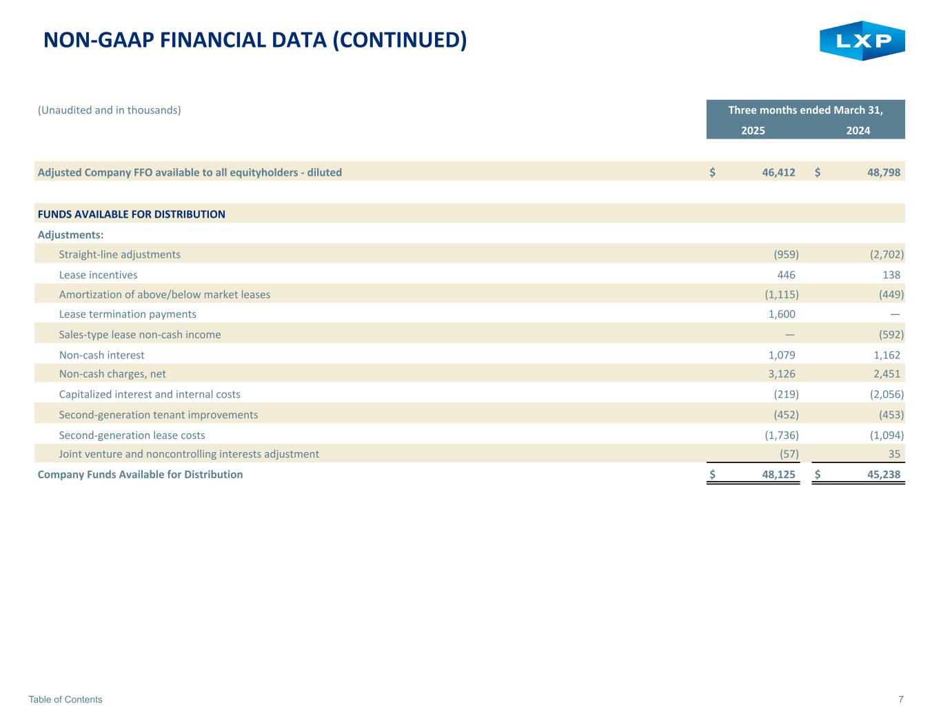 6目录NON-GAAP财务数据(未经审计,单位:千,股票和每股数据除外)截至3月31日的三个月,20252024年运营资金:基本和稀释:归属于普通股股东的净收入(亏损)$ 17,279 $(1,931)调整:与房地产相关的折旧和摊销48,82246,208租赁佣金摊销1,6901,301合资企业和非控制性权益调整1,2071,563出售房地产收益(24,635)—普通股股东可获得的FFO-基本44,36347,141优先股息1,5721,572分配给参与证券的金额12790 FFO可供所有权益持有人-稀释后46,06248,803备抵信用损失——(5)债务清偿损失350 ——所有权益持有人可获得的调整后公司FFO-稀释后46,412美元每股普通股48,798美元金额:基本:FFO 0.15美元0.16美元稀释后:FFO 0.16美元0.16美元调整后公司FFO 0.16美元0.16美元加权平均普通股:基本:加权平均已发行普通股-基本每股收益291,706,064291,288,383股加权平均已发行普通股-基本FFO 291,706,064291,288,383股稀释后:加权平均已发行普通股-稀释后每股收益292,298,271291,288,383股优先股-C系列4,710,5704,710,570股加权平均已发行普通股-稀释FFO 297,008,841295,998,953