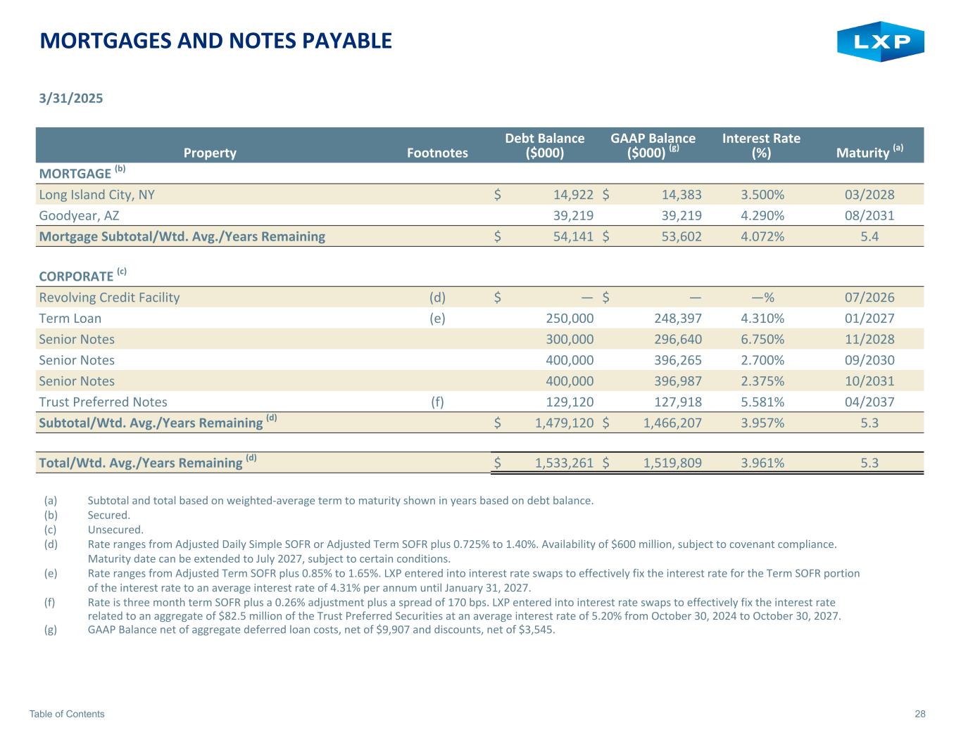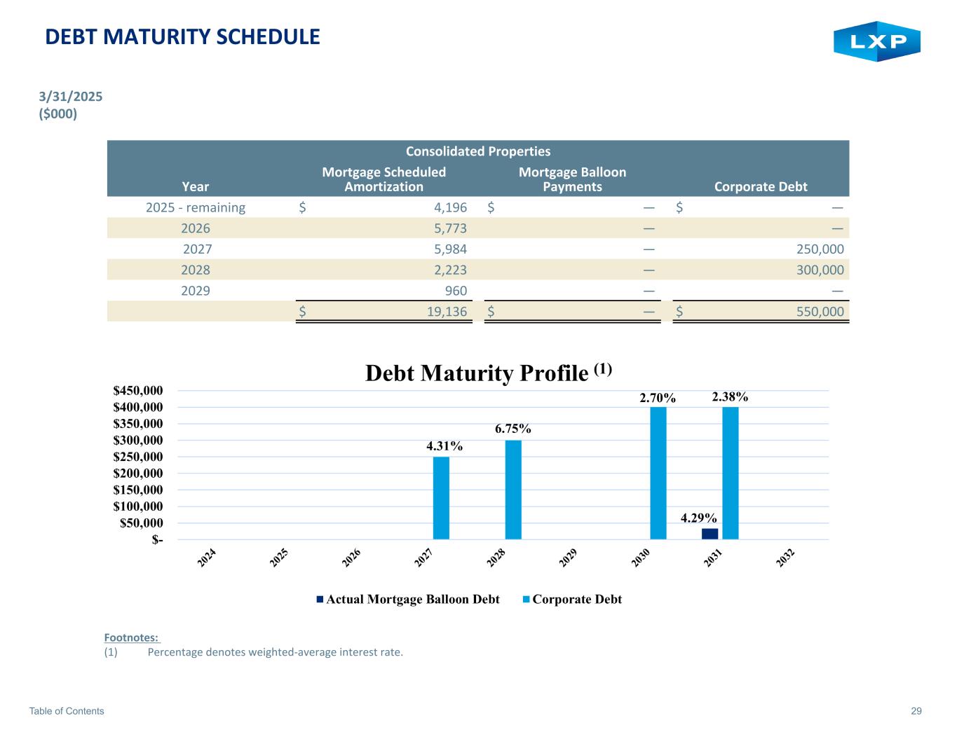 28目录抵押贷款和应付票据3/31/2025物业脚注债务余额(000美元)GAAP余额(000美元)(g)利率(%)到期(a)抵押贷款(b)长岛市,NY 14,922美元14,3833.500% 03/2028固特异,AZ 39,21939,2194.290% 08/2031抵押小计/WTD。平均/年剩余54,141美元53,6024.072% 5.4企业(c)循环信贷(d)$ — $ ——% 07/2026定期贷款(e)250,000248,3974.3 10% 01/2027优先票据300,000296,6406.750% 11/2028优先票据400,000396,2652.700% 09/2030优先票据400,000396,9872.375% 10/2031信托优先票据(f)129,120127,9185.581% 04/2037小计/WTD。平均/年剩余(d)$ 1,479,120 $ 1,466,2073.957% 5.3总计/WTD。平均/年剩余(d)1,533,261美元1,519,8093.961% 5.3(a)小计和总额,根据加权平均到期期限,按年按债务余额列示。(b)担保。(c)无担保。(d)利率范围从调整后的每日简单SOFR或调整后的期限SOFR加0.725%至1.40%。可用6亿美元,以遵守契约为准。到期日可延长至2027年7月,但须符合特定条件。(e)利率范围从调整后的期限SOFR加0.85%到1.65%。LXP订立利率互换以有效将Term SOFR部分利率固定为平均年利率4.31%至2027年1月31日。(f)利率为三个月期限SOFR加上0.26%的调整加上170个基点的利差。LXP订立利率互换,以有效厘定由2024年10月30日至2027年10月30日期间合共8,250万美元信托优先证券的平均利率为5.20%的相关利率。(g)GAAP余额扣除递延贷款总成本净额9907美元和折扣净额3545美元。