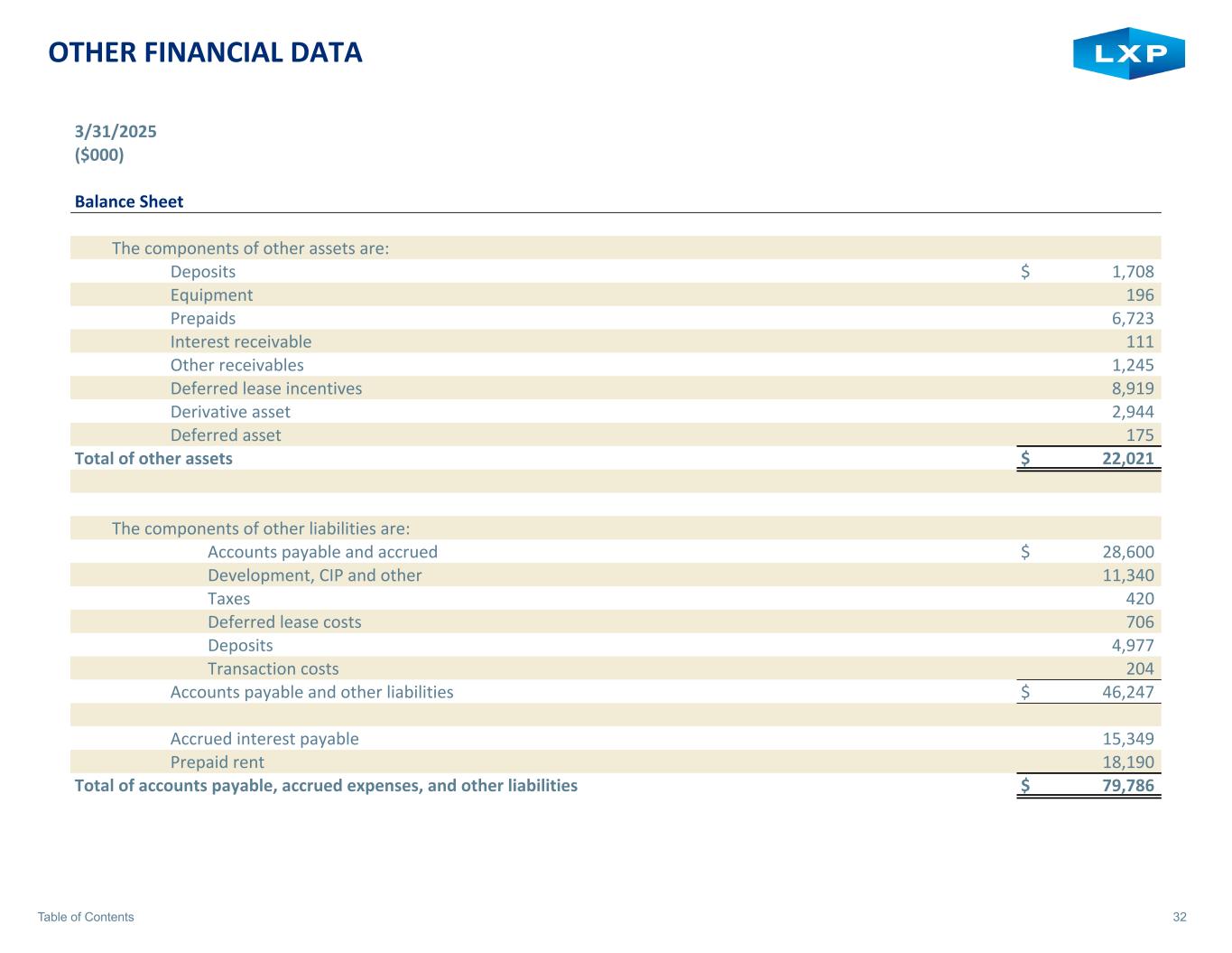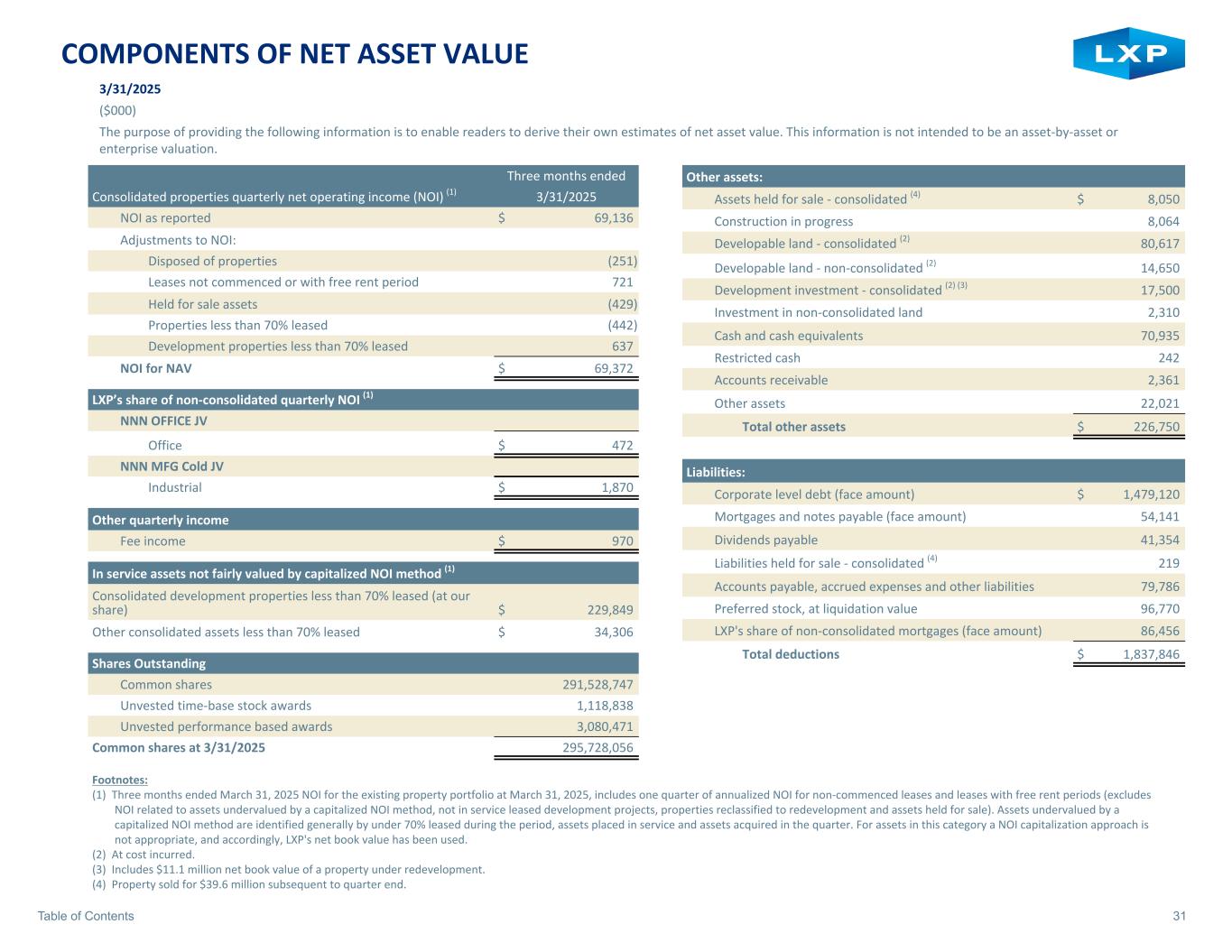 31资产净值的目录组成部分脚注:(1)截至2025年3月31日的现有物业组合的截至2025年3月31日的三个月NOI,包括未开始租赁和有免费租期的租赁的年化NOI的四分之一(不包括与以资本化NOI法低估的资产相关的NOI,不包括服务租赁开发项目、重新分类为再开发的物业和持有待售资产)。按资本化NOI法被低估的资产通常通过期间租赁低于70%、投入使用的资产和本季度收购的资产来识别。对于此类资产,NOI资本化方法不合适,因此使用了LXP的账面净值。(2)按发生的成本计算。(3)包括正在重建的物业的账面净值1110万美元。(4)季度末后以3960万美元的价格出售物业。3/31/2025(000美元)提供以下信息的目的是使读者能够得出自己对资产净值的估计。这些信息并非旨在逐个资产或企业估值。截至三个月的综合物业季度净营业收入(NOI)(1)3/31/2025 NOI报告的69136美元NOI调整:处置物业(251)租赁未开始或有免费租期的721持作出售资产(429)低于70%的物业已出租(442)低于70%的开发物业已出租637 NOINAV 69,372美元LXP在非合并季度NOI中的份额(1)NNN办公室合资办公室472美元NNNMFG Cold JV Industrial 1,870美元其他季度收入费用收入970美元未按资本化NOI法公允估值的服务资产(1)低于70%租赁的合并开发物业(按我们的份额)229,849美元低于70%租赁的其他合并资产34,306美元已发行普通股291,528,747未归属的基于时间的股票奖励1,118,838未归属的基于业绩的奖励3,080,471股普通股于2025年3月31日295,728,056其他资产:持有资产出售-合并(4)$ 8,050在建工程8,064可开发土地-合并(2)80,617可开发土地-非合并(2)14,650开发投资-合并(2)(3)17,500非合并土地投资2,310现金及现金等价物70,935受限现金242应收账款2,361其他资产22,021其他资产总额226,750美元负债:公司一级债务(面额)1,479,120美元抵押贷款和应付票据(面额)54,141应付股利41,354持作出售的负债-合并(4)219应付账款、应计费用和其他负债79,786优先股,按清算价值计算的96,770份LXP在非合并抵押贷款中的份额(面值金额)86,456扣除总额1,837,846美元
