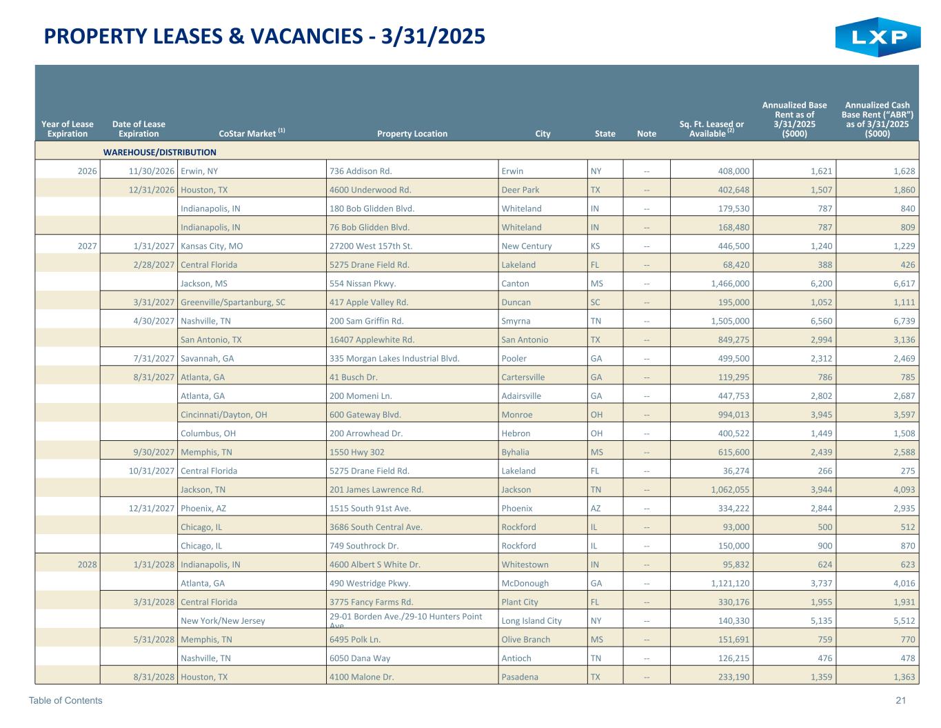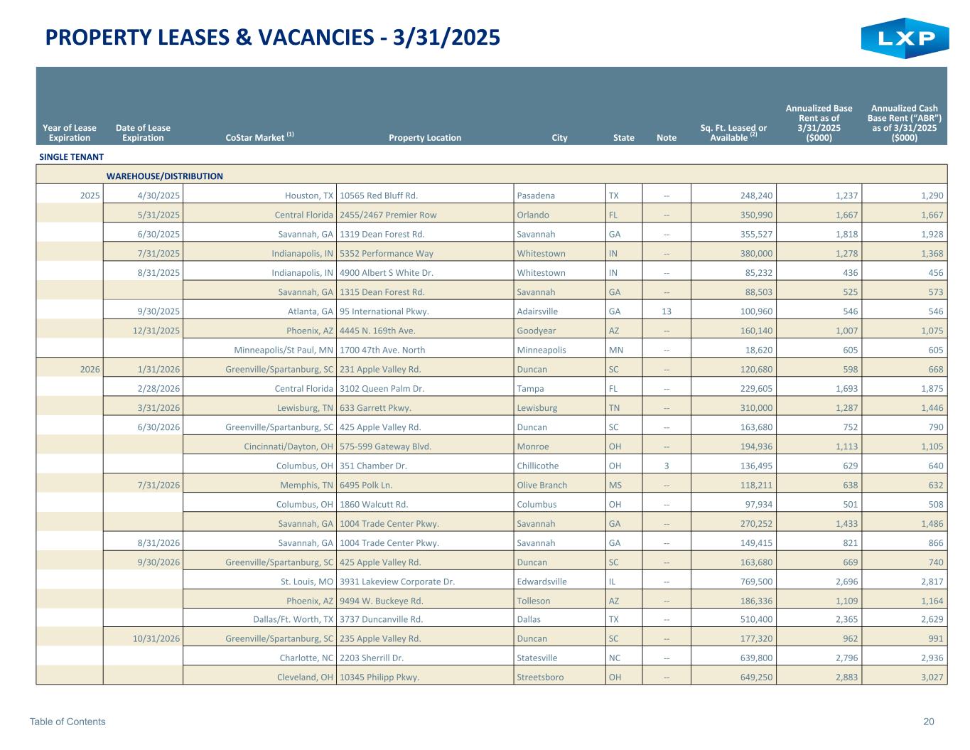 20目录物业租赁&空缺-3/31/2025租约年份到期日租约到期CoStar Market(1)物业位置City State Note Sq。英尺。租赁或可用(2)截至2025年3月31日的年化基础租金(000美元)截至2025年3月31日的年化现金基础租金(“ABR”)(000美元)单租户仓库/分配20254/30/2025 Houston,TX 10565 Red Bluff Rd. Pasadena TX--248,2401,2371,2905/31/2025 Central Florida 2455/2467 Premier Row Orlando FL--350,9901,6671,6671,6676/30/2025 Savannah,GA 1319 Dean Forest Rd. Savannah GA--355,5271,8181,9287/31/2025 Indianapolis,IN 5352 Performance Way Whitestown IN--380,0001,2781,3688/31/2025 IndianapGA 1315 Dean Forest Rd. Savannah GA--88,5035255739/30/2025 Atlanta,GA 95 International PKWY。Adairsville GA 13 100,96054654612/31/2025 Phoenix,AZ 4445 N. 169th Ave. Goodyear AZ--160,1401,0071,075 Minneapolis/St Paul,MN 1700 47th Ave. North Minneapolis MN--18,62060560520261/31/2026 Greenville/Spartanburg,SC 231 Apple Valley Rd. Duncan SC--120,6805986682/28/2026 Central Florida 3102 Queen Palm Dr. Tampa FL--229,6051,6931,8753/31/2026 Lewisburg,TN 633 Garrett PKWY。Lewisburg TN--310,0001,2871,4466/30/2026 Greenville/Spartanburg,SC 425 Apple Valley Rd. Duncan SC--163,680752790 Cincinnati/Dayton,OH 575-599 Gateway Blvd. Monroe OH--194,9361,1131,105 Columbus,OH 351 Chamber Dr. Chillicothe OH 3136,4956296407/31/2026 Memphis,TN 6495 Polk Ln。Olive Branch MS--118,211638632 Columbus,OH 1860 Walcutt Rd. Columbus OH--97,934501508 Savannah,GA 1004 Trade Center PKWY。Savannah GA--270,2521,4331,4868/31/2026 Savannah,GA 1004贸易中心PKWY。Savannah GA--149,4158218669/30/2026 Greenville/Spartanburg,SC 425 Apple Valley Rd. Duncan SC--163,680669740 St. Louis,MO 3931 Lakeview Corporate Dr. Edwardsville IL--769,500 2,6962,817 Phoenix,AZ 9494 W. Buckeye Rd. Tolleson AZ--186,3361,1091,164 Dallas/ft. Worth,TX 3737 Duncanville Rd. Dallas TX--510,4002,3652,62910/31/2026 Greenville/Spartanburg,SC 235 Apple Valley Rd. Duncan SC--177,320962991 Charlotte,NC 2203 Sherrill DStreetsboro OH--649,2502,8833,027