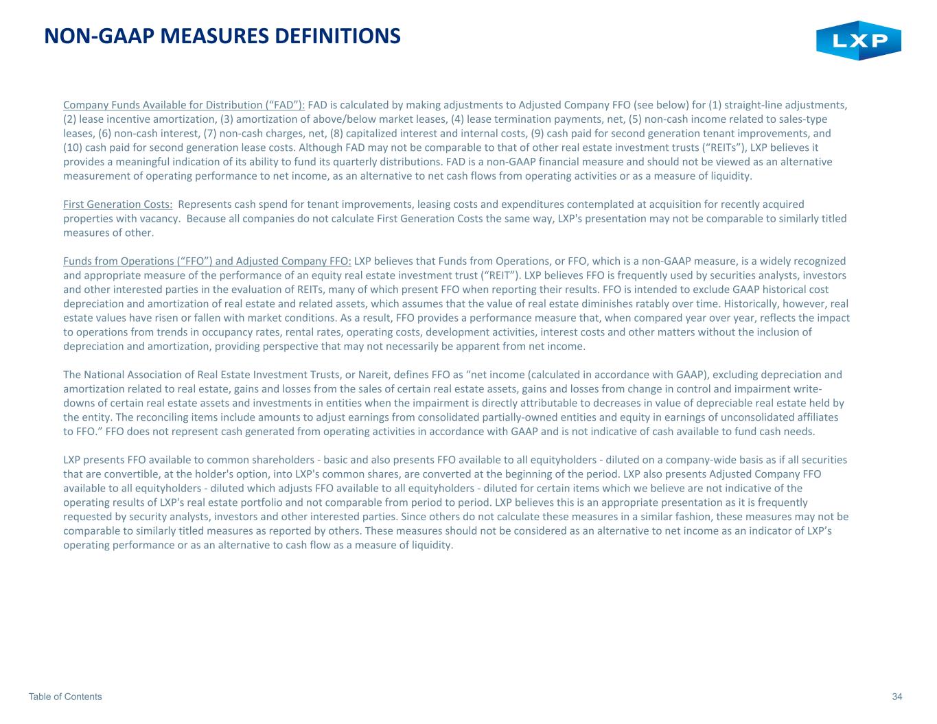 34目录非公认会计准则计量定义公司可用于分配的资金(“FAD”):FAD的计算方法是对调整后的公司FFO(见下文)进行调整,用于(1)直线调整,(2)租赁奖励摊销,(3)高于/低于市场租赁的摊销,(4)租赁终止付款净额,(5)与销售类租赁相关的非现金收入,(6)非现金利息,(7)非现金费用净额,(8)资本化利息和内部成本,(9)为第二代租户改进支付的现金,以及(10)为第二代租赁费用支付的现金。尽管FAD可能无法与其他房地产投资信托基金(“REIT”)相比,但LXP认为,FAD提供了一个有意义的指标,表明其为季度分配提供资金的能力。FAD是一种非GAAP财务衡量指标,不应被视为替代净收入的经营业绩衡量指标、替代经营活动产生的净现金流量衡量指标或流动性衡量指标。第一代成本:指用于租户改善的现金支出、租赁成本以及最近收购的空置物业在收购时预期的支出。因为并非所有公司计算第一代成本的方式都相同,所以LXP的演示文稿可能无法与其他类似标题的衡量标准进行比较。运营资金(“FFO”)和调整后公司FFO:LXP认为,运营资金(FFO)是一种非公认会计准则的衡量标准,是广泛认可且适当的衡量权益型房地产投资信托基金(“REIT”)业绩的指标。LXP认为,证券分析师、投资者和其他感兴趣的各方在评估REITs时经常使用FFO,其中许多在报告结果时会提出FFO。FFO旨在排除不动产和相关资产的GAAP历史成本折旧和摊销,后者假设不动产的价值随着时间的推移而相应减少。然而,从历史上看,房地产价值随市场状况而上升或下降。因此,FFO提供了一种绩效衡量标准,当与年度进行比较时,它反映了出租率、租金、运营成本、开发活动、利息成本和其他事项的趋势对运营的影响,而不包括折旧和摊销,提供了可能不一定从净收入中明显可见的视角。美国全国房地产投资信托协会(National Association of Real Estate Investment Trusts,简称Nareit)将FFO定义为“净收入(按照公认会计原则计算),不包括与房地产相关的折旧和摊销、出售某些房地产资产的损益、控制权变更和减值减记的损益——当减值直接归因于实体持有的可折旧房地产价值下降时,某些房地产资产和对实体的投资。调节项目包括将合并部分拥有实体的收益和未合并关联公司收益中的权益调整为FFO的金额。”FFO不代表根据公认会计原则从经营活动中产生的现金,也不表示可用于满足现金需求的现金。LXP呈现普通股股东可获得的FFO-基本的,也呈现所有权益持有人可获得的FFO-在全公司范围内稀释,就好像所有可由持有人选择转换为LXP普通股的证券在期初都已转换一样。LXP还提供了适用于所有权益持有人的调整后公司FFO-稀释后即调整适用于所有权益持有人的FFO-对于我们认为不代表LXP房地产投资组合经营业绩且不能在不同时期进行比较的某些项目进行稀释。由于证券分析师、投资者和其他相关方经常提出要求,LXP认为这是一个适当的演示文稿。由于其他人没有以类似的方式计算这些措施,这些措施可能无法与其他人报告的类似标题的措施进行比较。不应将这些衡量标准视为替代净收入作为LXP经营业绩的指标,也不应视为替代现金流作为流动性衡量标准。