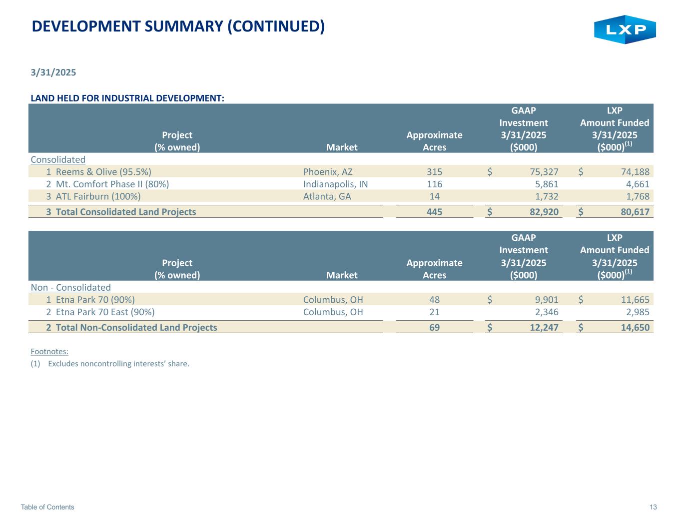 13目录发展摘要(续)3/31/2025为工业发展持有的土地:GAAP LXP投资金额资助项目约3/31/20253/31/2025(拥有百分比)市场英亩($ 000)($000)($ 000)(1)合并1 Reems & Olive(95.5%)Phoenix,AZ 315 $ 75,327 $ 74,1882 Mt. Comfort Phase II(80%)Indianapolis,IN 1165,8614,6613 ATL Fairburn(100%)Atlanta,GA 141,7321,7683总巩固土地项目445 $ 82,920 $ 80,617 GAAP LXP投资余额金额资助项目约3OH 48 $ 9,901 $ 11,6652 Etna Park 70 East(90%)Columbus,OH 212,3462,9852 Total non-consolidated land projects 69 $ 12,247 $ 14,650 footnotes:(1)excludes non-controlling interests ' share。