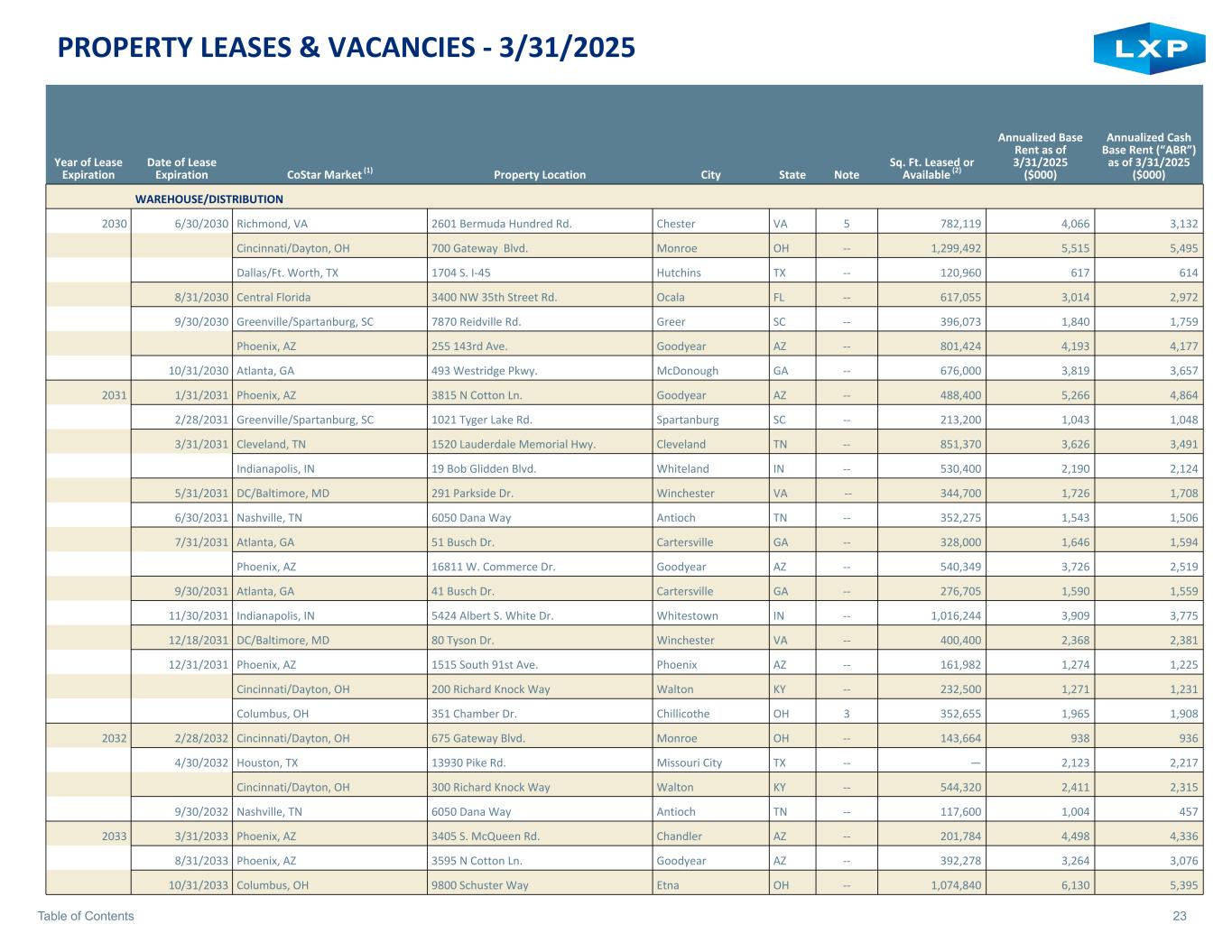 22目录物业租赁&空缺-3/31/2025租约年份到期日租约到期CoStar Market(1)物业位置City State Note Sq。英尺。租赁或可用(2)截至2025年3月31日的年化基础租金(000美元)截至2025年3月31日的年化现金基础租金(“ABR”)(000美元)仓库/分布20288/31/2028印第安纳波利斯,in 4900 Albert S White Dr. Whitestown in--63,84030932310/31/2028 Atlanta,GA 1625 Oakley Industrial Blvd. Fairburn GA--907,6754,2234,21520291/31/2029 Greenville/Spartanburg,SC 70 Tyger River Dr. Duncan SC-408,0002,5272,491 Indianapolis,IN 1285 W. State Road 32 Lebanon in--741,8802,6622,6862/28/2029 Greenville/SpartanGreer SC 4304,8841,7571,8623/31/2029 Indianapolis,in 4600 Albert S White Dr. Whitestown in--53,2403734224/30/2029 Greenville/Spartanburg,SC 230 Apple Valley Rd. Duncan SC--275,400 1,4201,402 Houston,TX 10535 Red Bluff Rd. Pasadena TX--257,8351,7411,862 Nashville,TN 6050 达纳 Way Antioch TN---11,2381651655/31/2029 Atlanta,GA 7225 Goodson Rd. Union City GA--370,0002,5772,479 Atlanta,GA 1001 Old Grassdale Rd CartersvilleOlive Branch MS--1,170,2184,1014,0487/31/2029 Greenville/Spartanburg,SC 5795 North Blackstock Rd. Spartanburg SC--341,6601,7051,705 Memphis,TN 8500 Nail Rd. Olive Branch MS--716,0802,7512,8298/31/2029 Dallas/ft. Worth,TX 8601 E. 李灿森 LN。Northlake TX--1,214,5264,2784,2999/30/2029印第安纳波利斯,1627 Veterans Memorial PKWY。E. Lafayette IN--309,4001,4271,439 Memphis,TN 3820 Micro Dr. Millington TN--701,8192,7062,578 Memphis,TN 11555 Silo Dr. Olive Branch MS--927,7422,6613,943 Savannah,GA 1001 Gateway PKWY。Rincon GA--68,29171165610/14/2029 Columbus,OH 10300 Schuster Way Etna OH--250,0202,0301,95810/31/2029 Houston,TX 9701 New Decade Dr. Pasadena TX--102,863766741 Nashville,TN 6050 达纳 Way Antioch TN--67,20060257811/21/2029 Columbus,OH 1860 Walcutt Rd. Columbus OH---194,79698396812/31/2029 Greenville/Spartanburg,SC 402 Apple Valley Rd. Duncan SC--235,6001,2631,24420301/31/2030 Atlanta,GA 7875 White RTN 549 Wingo Rd. Byhalia MS--855,8784,3884,6345/31/2030 St. Louis,MO 4015 Lakeview Corporate Dr. Edwardsville IL--1,017,7803,4603,130