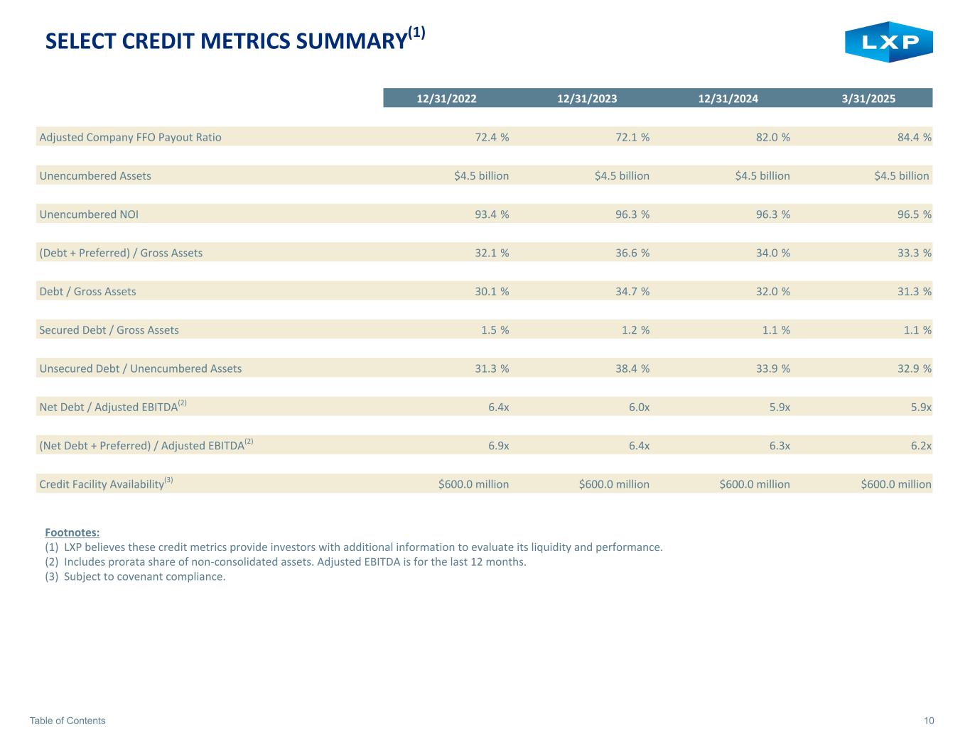 10目录选择信用指标摘要(1)12/31/202212/31/202312/31/20243/31/2025调整后公司FFO派息率72.4% 72.1% 82.0% 84.4%未支配资产45亿美元45亿美元45亿美元未支配NOI 93.4% 96.3% 96.3% 96.5%(债务+优先)/总资产32.1% 36.6% 34.0% 33.3%债务/总资产30.1% 34.7% 32.0% 31.3%有担保债务/总资产1.5% 1.2% 1.1% 1.1%无担保债务/未支配资产31.3% 38.4% 33.9% 32.9%净债务/调整EBITDA(2)6.4x 6.0x 5.9x 5.9x(净债务+优先)/调整后EBITDA(2)6.9x 6.4x 6.3x 6.2 x信贷融资可用性(3)6.00亿美元6.00亿美元6.00亿美元6.00亿美元脚注:(1)LXP认为,这些信用指标为投资者提供了评估其流动性和业绩的额外信息。(2)包括按比例分摊的非合并资产。调整后EBITDA为最近12个月。(3)在符合契诺的情况下。