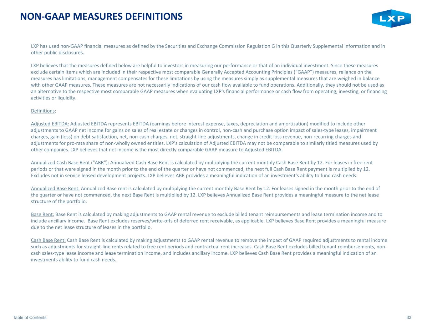 33目录NON-GAAP措施定义LXP在本季度补充信息和其他公开披露中使用了美国证券交易委员会条例G定义的非GAAP财务措施。LXP认为,以下定义的衡量标准有助于投资者衡量我们或个人投资的业绩。由于这些措施不包括包含在各自最具可比性的公认会计原则(“GAAP”)措施中的某些项目,因此对这些措施的依赖具有局限性;管理层通过简单地将这些措施用作与其他GAAP措施权衡的补充措施来补偿这些局限性。这些衡量指标并不一定表明我们可用于为运营提供资金的现金流。此外,在评估LXP的财务业绩或经营、投资、融资活动或流动性产生的现金流量时,不应将它们用作各自最具可比性的GAAP衡量标准的替代方法。定义:调整后EBITDA:调整后EBITDA是指EBITDA(扣除利息费用、税项、折旧和摊销前的利润),经修改后包括对GAAP净收入的其他调整,用于销售房地产的收益或控制权变更、销售类租赁的非现金和购买选择权影响、减值费用、债务清偿的收益(损失)、净额、非现金费用、净额、直线调整、信用损失收入变化、非经常性费用和非全资实体按比例份额的调整。LXP对调整后EBITDA的计算可能无法与其他公司使用的类似名称的衡量标准进行比较。LXP认为,净收入是与调整后EBITDA最直接可比的GAAP衡量标准。年化现金基础租金(“ABR”):年化现金基础租金的计算方法是将当前每月现金基础租金乘以12。对于处于免费租期或在季度末前一个月签署或尚未开始的租约,下一次全额现金基础租金付款乘以12。不包括不在服务租赁开发项目中。LXP认为ABR提供了一项投资为现金需求提供资金的能力的有意义的指标。年化基租:年化基租按当前月基租乘以12。对于季度末前一个月签订或尚未开始的租约,下一次基本租金乘以12。LXP认为,年化基础租金为投资组合的净租赁结构提供了一个有意义的衡量标准。基本租金:基本租金的计算方法是对GAAP租金收入进行调整,以排除已计费的租户报销和租赁终止收入,并包括辅助收入。基本租金不包括递延应收租金的准备金/注销(如适用)。LXP认为,由于投资组合中租赁的净租赁结构,基本租金提供了一个有意义的衡量标准。现金基础租金:现金基础租金的计算方法是对GAAP租金收入进行调整,以消除GAAP要求的租金收入调整的影响,例如与免费租期和合同租金上涨相关的直线租金调整。现金基础租金不包括账单租户报销、非现金销售类租赁收入和租赁终止收入,并包括辅助收入。LXP认为,现金基础租金提供了一个有意义的指标,表明投资能力能够为现金需求提供资金。