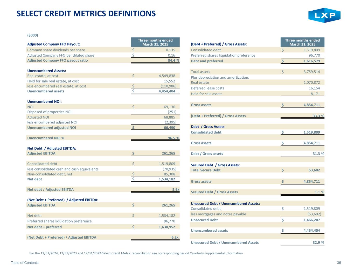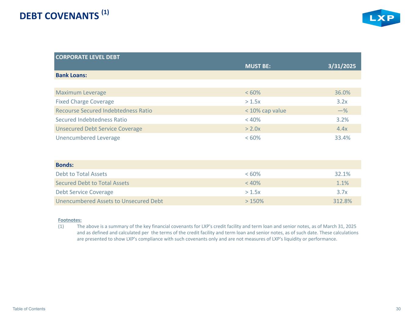 30目录债务契约(1)公司层面债务必须:3/31/2025银行贷款:最高杠杆< 60% 36.0%固定费用覆盖率> 1.5x 3.2x追索权有担保债务比率< 10%上限价值—%有担保债务比率< 40% 3.2%无担保偿债覆盖率> 2.0x 4.4x未设押杠杆< 60% 33.4%债券:债务占总资产的比例< 60% 32.1%有担保债务占总资产的比例< 40% 1.1%偿债覆盖率> 1.5x 3.7x未设押资产占无担保债务的比例> 150% 312.8%脚注:(1)以上为LXP主要财务契约摘要和定期贷款和优先票据,截至2025年3月31日,根据信贷安排和定期贷款和优先票据的条款定义和计算,截至该日期。这些计算旨在显示LXP对此类契约的遵守情况,而不是衡量LXP流动性或业绩的指标。