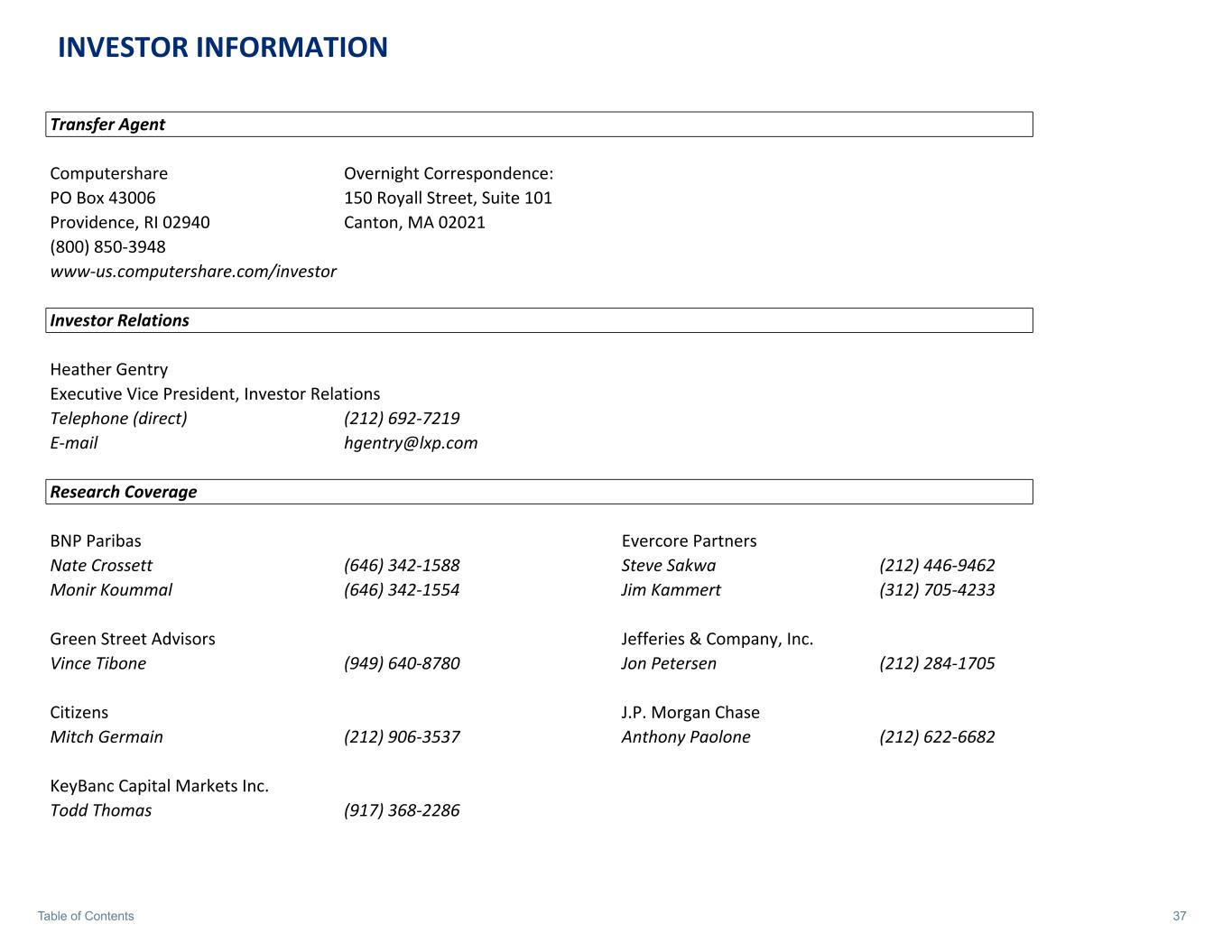 37目录投资者信息转让代理Computershare隔夜通讯:PO Box 43006150 Royall Street,Suite 101 Providence,RI 02940 Canton,MA 02021(800)850-3948 www-us.computershare.com/investor investor relations Heather Gentry执行副总裁,投资者关系电话(直接)(212)692-7219 E-mail hgentry@lxp.com研究报道法国巴黎银行Evercore Partners Nate Crossett(646)342-1588 Steve Sakwa(212)446-9462 Monir Koummal(646)342-1554 Jim Kammert(312)705-4233 Green Street Advisors Jefferies & Company,Inc. Vince Tibone(949)640-8780