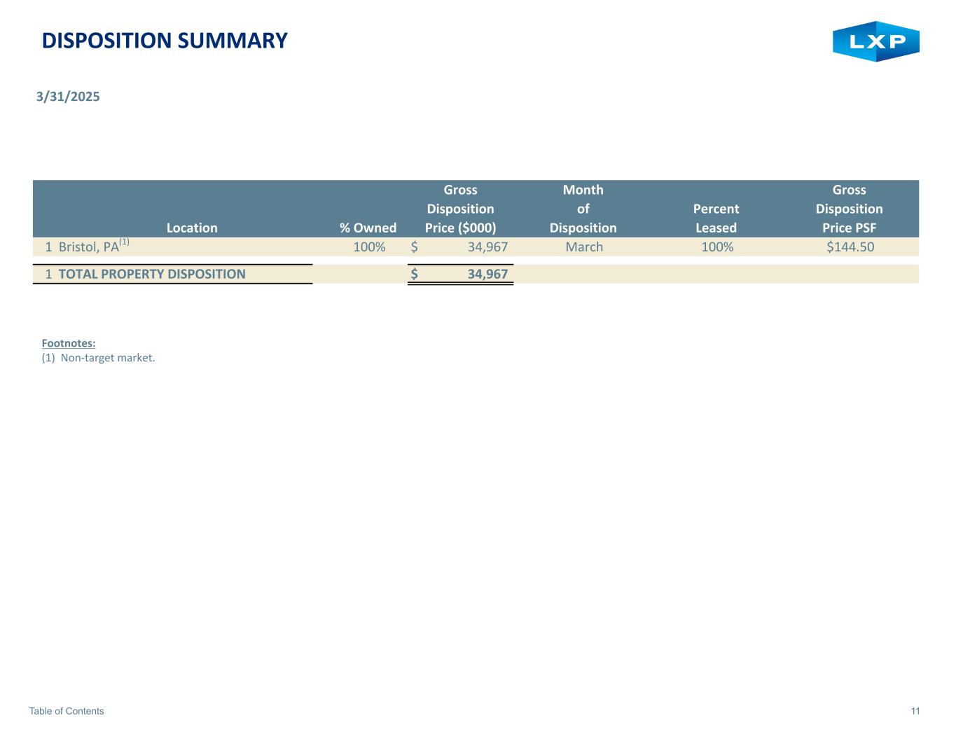 11目录处置摘要3/31/2025脚注:(1)非目标市场。毛月毛额处置百分比处置地位%自有价格(000美元)处置租赁价格PSF 1 Bristol,PA(1)100% $ 34,967 March 100% $ 144.501总财产处置$ 34,967