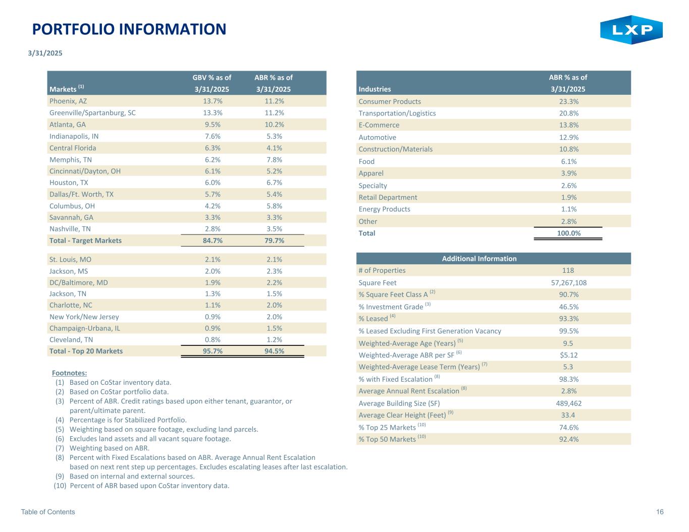 3目录季度亮点-净收入-每股摊薄普通股0.06美元-调整后公司FFO-每股摊薄普通股0.16美元-2025年同店NOI较2024年增长5.2%-完成540,000平方英尺的租约延期,基础和现金基础租金分别增长52.5%和58.9%-开始重建250,000平方英尺的仓库设施-以3500万美元的总处置价格处置了一个仓库设施-偿还了3亿美元定期贷款中的5000万美元摘要/要点3月31日,2025 LXP是一家房地产投资信托基金(“REIT”),专注于在阳光地带和中西部下游的12个目标市场进行A类、仓库和分销房地产投资。物业组合统计#:118 #州:16平方尺:5730万%方尺A级:90.7%稳定组合%租赁:93.3% #租赁:132加权-平均租赁期限(年):5.3年加权-平均年限:9.5年可开发土地:(1)514英亩脚注(1)包括综合和非综合可开发土地。