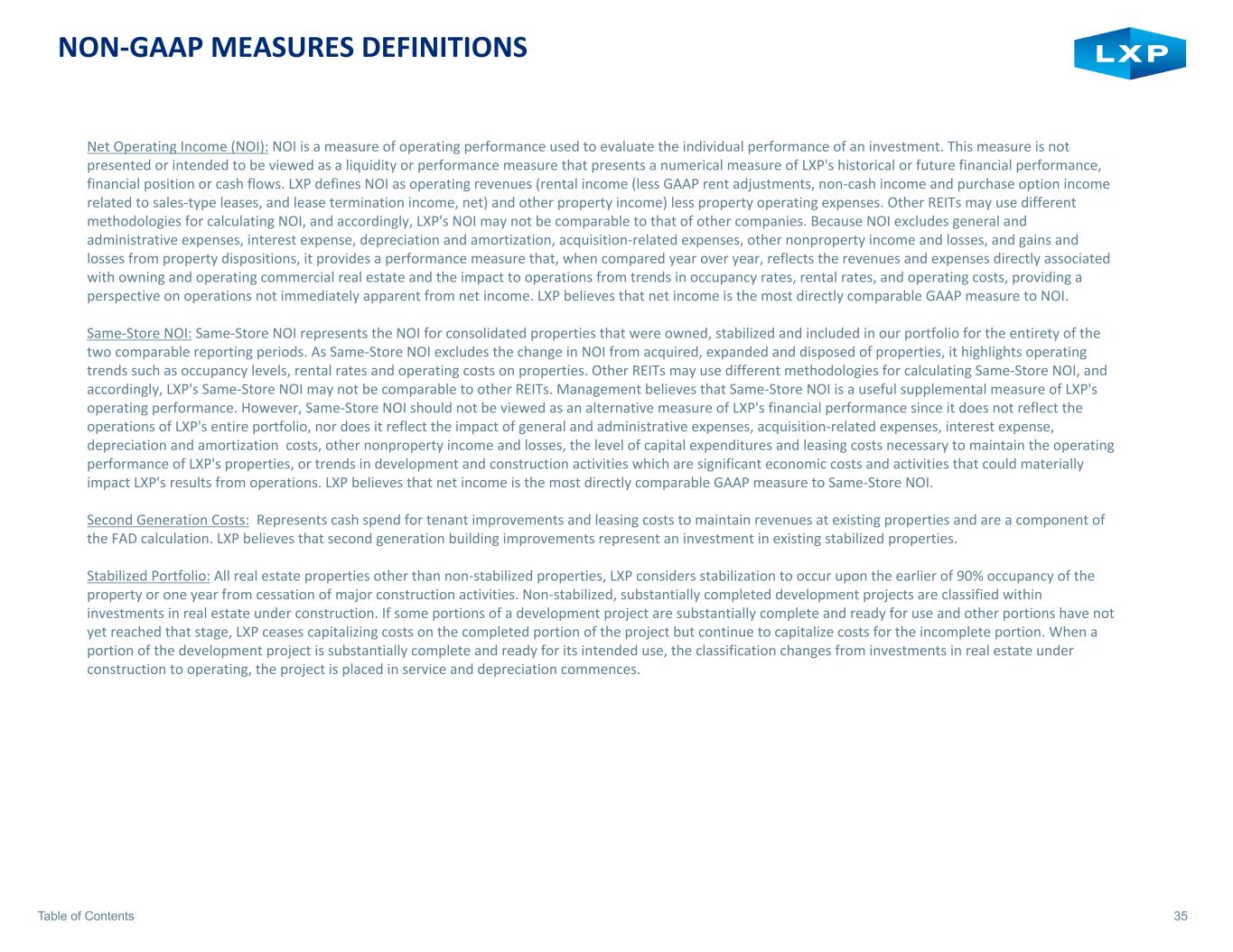 35目录NON-GAAP衡量标准定义净营业收入(NOI):NOI是一种衡量经营业绩的指标,用于评估投资的个别表现。此衡量标准未提出或不打算被视为流动性或业绩衡量标准,以数字方式衡量LXP历史或未来的财务业绩、财务状况或现金流量。LXP将NOI定义为营业收入(租金收入(减去GAAP租金调整、与销售型租赁相关的非现金收入和购买选择权收入以及租赁终止收入,净额)和其他财产收入)减去财产运营费用。其他REITs可能使用不同的计算NOI的方法,因此,LXP的NOI可能无法与其他公司进行比较。由于NOI不包括一般和管理费用、利息费用、折旧和摊销、与收购相关的费用、其他非财产收入和损失以及财产处置的损益,因此它提供了一种绩效衡量标准,在逐年比较时,它反映了与拥有和经营商业房地产直接相关的收入和支出,以及出租率、租金和运营成本趋势对运营的影响,提供了一个从净收入中不能立即显现的运营视角。LXP认为,净收入是与NOI最直接可比的GAAP衡量标准。同店NOI:同店NOI代表在整个两个可比报告期间拥有、稳定并包含在我们投资组合中的合并物业的NOI。由于同店NOI不包括收购、扩建和处置物业的NOI变化,它突出了物业的入住率、租金和运营成本等运营趋势。其他REITs可能会使用不同的计算同店NOI的方法,因此,LXP的同店NOI可能无法与其他REITs进行比较。管理层认为,同店NOI是LXP经营业绩的有用补充衡量标准。然而,同店NOI不应被视为衡量LXP财务业绩的替代指标,因为它并不反映LXP整个投资组合的运营情况,也不反映一般和行政费用、购置相关费用、利息费用、折旧和摊销成本、其他非财产损益、维持LXP物业经营业绩所需的资本支出和租赁成本水平,或属于重大经济成本的开发和建设活动的趋势,这些都是可能从经营中对LXP的业绩产生重大影响的重大经济成本和活动。LXP认为,净收入是与同店NOI最直接可比的GAAP衡量标准。第二代成本:代表用于租户改善和租赁成本的现金支出,以维持现有物业的收入,是FAD计算的组成部分。LXP认为,第二代建筑改进代表了对现有稳定物业的投资。稳定投资组合:除不稳定物业外的所有房地产物业,LXP认为稳定发生于该物业的出租率达90%或自主要建筑活动停止起一年(以较早者为准)。非稳定、基本完成的开发项目归入在建房地产投资。如果开发项目的某些部分已基本完成并可供使用而其他部分尚未达到该阶段,LXP将停止对项目的已完成部分进行成本资本化,但继续对未完成部分进行成本资本化。当开发项目的一部分基本完成并达到预定可使用状态时,分类由在建房地产投资变为经营,项目投入使用并开始折旧。