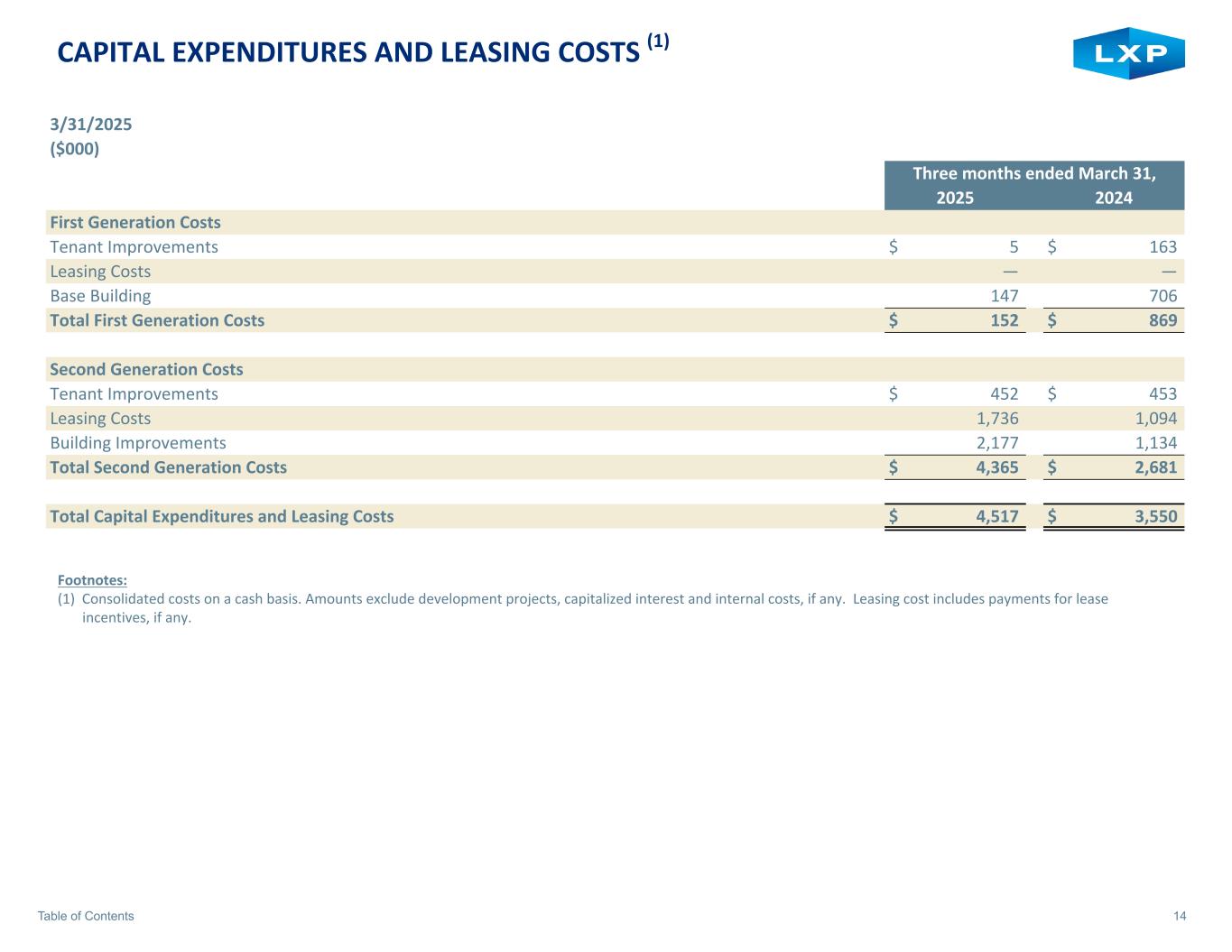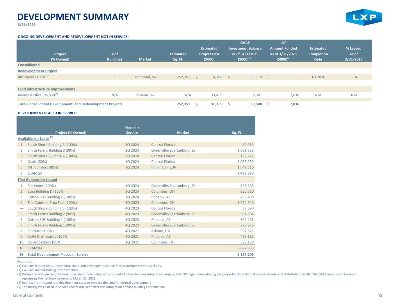 12目录发展概要发展放置于服务:放置于项目(拥有百分比)服务市场SQ。FT.可供出租(5)1 South Shore Building B(100%)Q3 2024 Central Florida 80,9832 Smith Farms Building 3(90%)2Q 2024 Greenville/Spartanburg,SC 1,091,8883 South Shore Building A(100%)2Q 2024 Central Florida 132,2124 Ocala(80%)1Q2024 Central Florida 1,085,2805 Mt. Comfort(80%)1Q2024 Indianapolis,in 1,049,5105小计3,439,873 First Generation Leased 1 Piedmont(100%)Q4 2024 Greenville/Spartanburg,SC 625,2382 Etna Building D(100%)Q3 2024 Columbus,OH 250,0203 Cotton 303 BuildingAZ 488,400 4 The Cubes at Etna East(100%)4Q 2023 Columbus,OH 1,074,840 — South Shore Building B(100%)4Q 2023 Central Florida 57,6905 Smith Farms Building 2(90%)4Q 2023 Greenville/Spartanburg,SC 304,8846 Cotton 303 Building 1(100%)1Q 2023 Phoenix,AZ 392,2787 Smith Farms Building 1(90%)4Q 2022 Greenville/Spartanburg,SC 797,9368 Fairburn(100%)4Q 2021 Atlanta,GA 907,6759 KeHE Distributors(100%)4Q 2021 Phoenix,AZ 468,18210 RickenBacker(不完全成本,以及开发者奖励费用或合作伙伴推广,如果有的话。(2)不包括非控制性权益的份额。(3)在第一季度,租户腾出了该大楼,该大楼是四栋楼综合园区的一部分,而LXP开始将该物业重新开发为独立的仓库和配送设施。GAAP投资余额代表截至2025年3月31日的账面净值。(4)代表基础设施开发成本准备土地垂直开发。(5)该设施在基地建筑施工完成一年后空置投入使用。3/31/2025进行中的开发和重新开发未服务:GAAP LXP估计投资余额金额已出资估计租赁项目#占截至2025年3月31日截至2025年3月31日估计项目成本的百分比截至(拥有百分比)Buildings Market Sq.的完成情况。FT.($000)($000)(1)($000)(2)日期3/31/2025综合重建项目里士满(100%)(3)1弗吉尼亚州里士满252,351美元4,700美元11,119美元— 2026年第一季度— %土地基础设施改善Reems & Olive(95.5%)(4)不适用亚利桑那州凤凰城不适用11,4596,3817,036不适用综合发展和重建项目总额252,351美元16,159美元17,500美元7,036