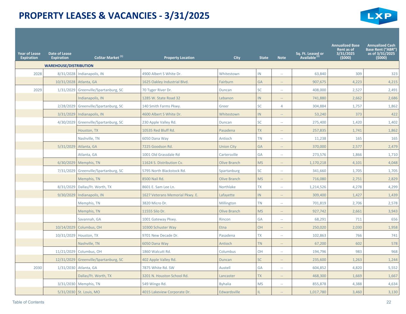 21目录物业租赁&空缺-3/31/2025租约年份到期日租约到期CoStar Market(1)物业位置City State Note SQ。英尺。租赁或可用(2)截至2025年3月31日的年化基础租金(000美元)截至2025年3月31日的年化现金基础租金(“ABR”)(000美元)仓库/分配202611/30/2026 Erwin,NY 736 Addison Rd. Erwin NY--408,0001,6211,62812/31/2026 Houston,TX 4600 Underwood Rd. Deer Park TX--402,6481,5071,860 Indianapolis,in 180 Bob Glidden Blvd. Whiteland IN-179,530 787840 Indianapolis,in 76 Bob Glidden Blvd. Whiteland IN--168,4807878092027 1/31/2027堪萨斯城,MO 27200 West 157th St. New Century KS--446,500 1,2401,2292/28/2027 Central Florida 5275 Drane Field Rd. Lakeland FL--68,420388426 Jackson,MS 554 Nissan PKWY。Canton MS--1,466,0006,2006,6173/31/2027 Greenville/Spartanburg,SC 417 Apple Valley Rd. Duncan SC--195,0001,0521,1114/30/2027 Nashville,TN 200 Sam Griffin Rd. Smyrna TN--1,505,0006,5606,739 San Antonio,TX 16407 AppleWhite Rd. San Antonio TX--849,2752,9943,1367/31/2027 Savannah,GA 335 Morgan Lakes Industrial Blvd. Pooler GA--499,5002,3122,4698/31/2027 Atlanta,GA 41 Busch Dr. Cartersville GA--119,295786785 AtlantAdairsville GA--447,7532,8022,687 Cincinnati/Dayton,OH 600 Gateway Blvd. Monroe OH--994,0133,9453,597 Columbus,OH 200 Arrowhead Dr. Hebron OH--400,5221,4491,5089/30/2027 Memphis,TN 1550 Hwy 302 Byhalia MS--615,6002,4392,58810/31/2027 Central Florida 5275 Drane Field Rd. Lakeland FL--36,274266275 Jackson,TN 201 James Lawrence Rd. Jackson TN--1,062,0553,9444,09312/31/2027 Phoenix,IL 749 Southrock Dr. Rockford IL--150,00090087020281/31/2028 Indianapolis,in 4600 Albert S White Dr. Whitestown in--95,832624623 Atlanta,GA 490 Westridge PKWY。McDonough GA--1,121,1203,7374,0163/31/2028 Central Florida 3775 Fancy Farms Rd. Plant City FL--330,1761,9551,931 New York/New Jersey 29-01 Borden Ave./29-10 Hunters Point Ave. Long Island City NY--140,3305,1355,5125/31/2028 Memphis,TN 6495 Polk Ln。Olive Branch MS--151,691759770 Nashville,TN 6050 达纳 Way Antioch TN--126,2154764788/31/2028 Houston,TX 4100 Malone Dr. Pasadena TX--233,1901,3591,363