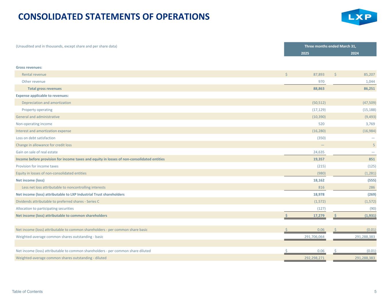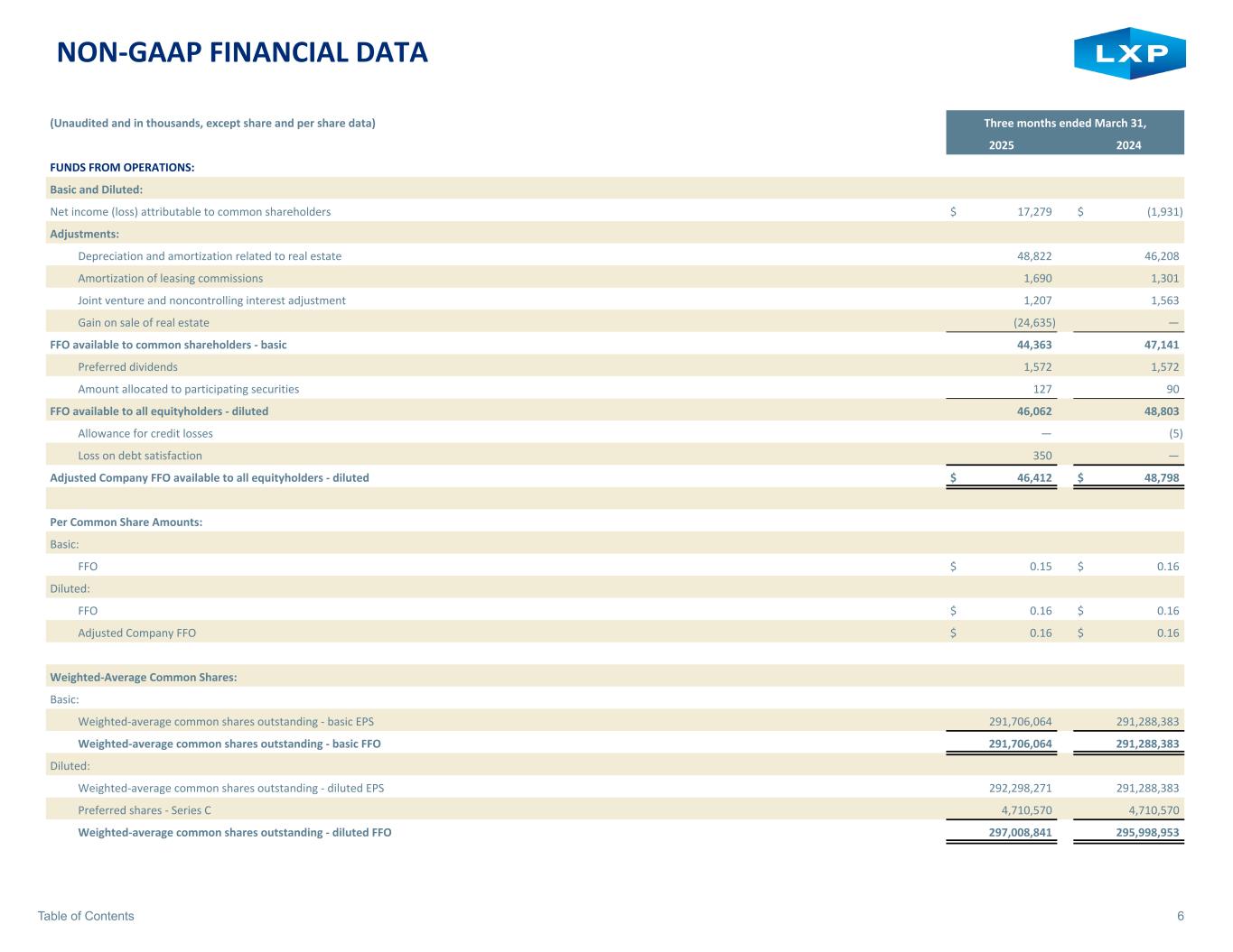 5目录合并经营报表(未经审计,单位:千,股份和每股数据除外)截至3月31日止三个月,20252024总收入:租金收入87,893美元85,207美元其他收入9701,044总收入88,86386,251适用于收入的费用:折旧和摊销(50,512)(47,509)物业经营(17,129)(15,188)一般和行政(10,390)(9,493)营业外收入523,769利息和摊销费用(16,280)(16,984)债务清偿损失(350)—信用损失准备变动— 5房地产销售收益24,635 —所得税拨备前收入和非合并实体亏损中的权益19,357851拨备所得税(215)(125)非合并实体亏损中的权益(980)(1,281)净收入(亏损)18,162(555)减去归属于非控股权益的净亏损816286归属于LXP Industrial Trust股东的净收入(亏损)18,978(269)归属于优先股的股息-C系列(1,572)(1,572)分配给参与证券(127)(90)归属于普通股股东的净收入(亏损)$ 17,279 $(1,931)归属于普通股股东的净收入(亏损)-每股普通股基本$ 0.06 $(0.01)加权平均已发行普通股-基本291,706,064291,288,383归属于普通股股东的净收入(亏损)-每股普通股稀释后$ 0.06 $(0.01)加权平均已发行普通股-稀释后292,298,271291,288,383