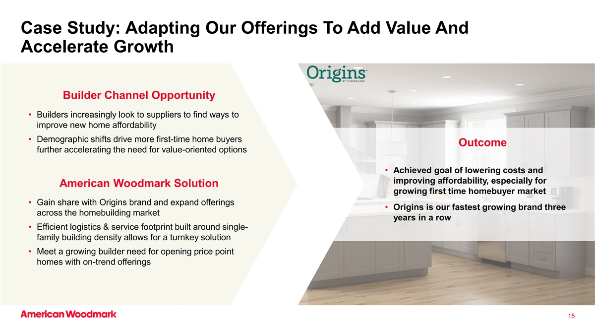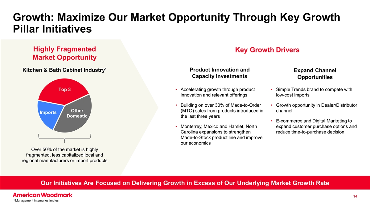 增长:通过关键增长支柱举措最大限度地利用我们的市场机会高度分散的关键增长动力市场机会1产品创新和厨浴柜行业扩大渠道能力投资机会Top3 •通过产品加速增长•简单趋势品牌与创新和相关产品竞争低成本进口•建立在按订单生产的30%以上的基础上•经销商/分销商其他(MTO)销售额的增长机会来自过去三年在国内渠道进口中引入的产品•电子商务和数字营销到•墨西哥蒙特雷和哈姆雷特,North扩大客户购买选择和Carolina扩张,以加强缩短购买时间决策库存产品线并改善我们的经济性超过50%的市场高度分散,资本较少的本地和区域制造商或进口产品我们的举措专注于实现超出我们基础市场增长率的增长141管理层内部估计
