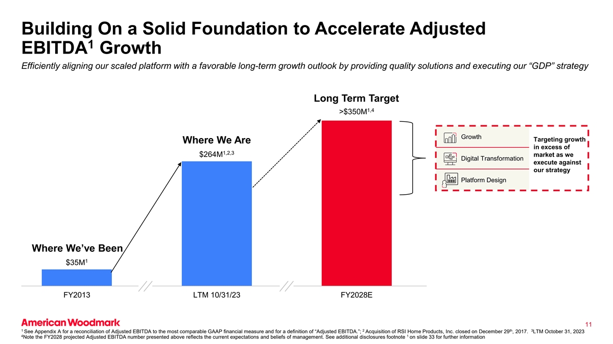 建立坚实基础以加速调整后1 EBITDA增长通过提供优质解决方案和执行我们的“GDP”战略EBITDA长期目标1,4 > 3.5亿美元的增长目标,在我们超过1,2,3市场的情况下有效地使我们的规模化平台与有利的长期增长前景保持一致,因为我们以2.64亿美元的数字化转型执行我们的战略平台设计,其中我们一直在1,3500万美元FY2013 LTM 10/31/23 FY2028E 1112 th3见附录A,了解调整后EBITDA与最具可比性的GAAP财务指标的对账情况以及“调整后EBITDA”的定义。;对RSI Home Products,Inc.的收购已于2017年12月29日结束。LTM 2023年10月31日41请注意,上述2028财年预计调整后EBITDA数字反映了管理层当前的预期和信念。有关更多信息,请参见幻灯片33上的额外披露脚注