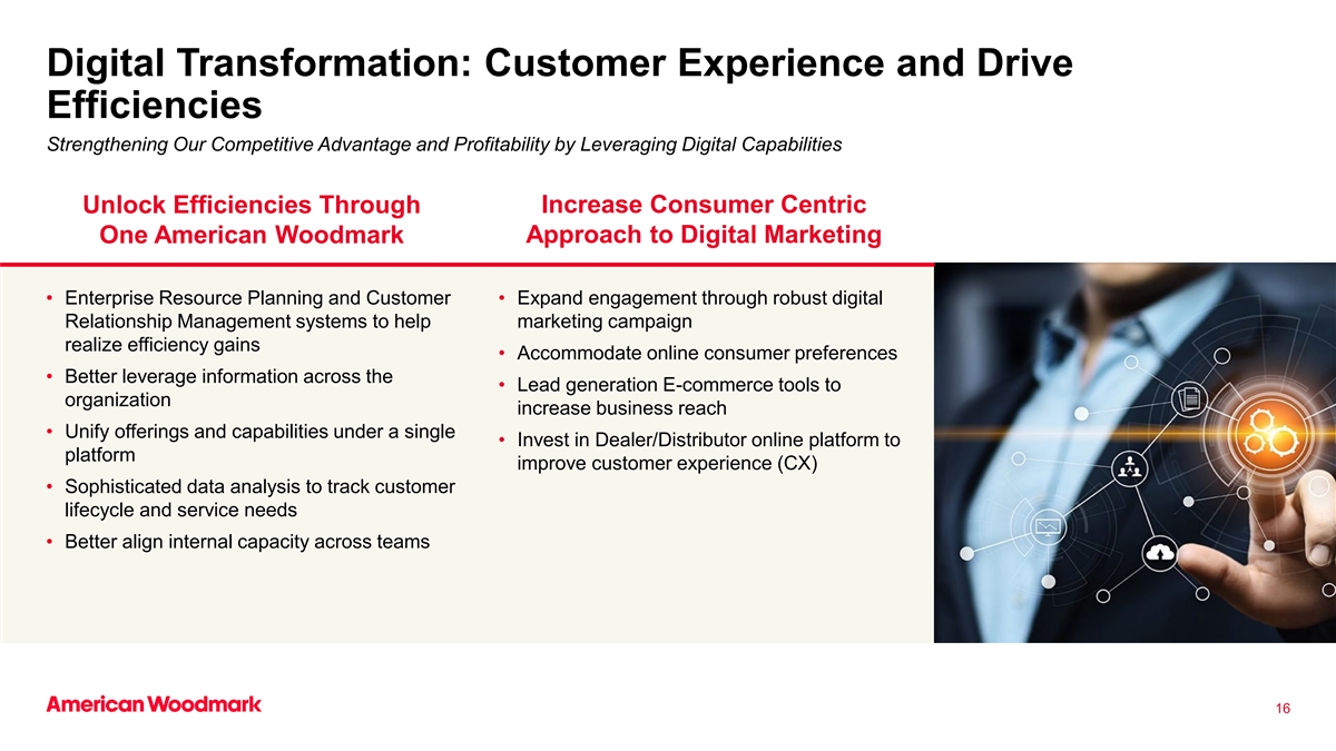 案例分析:调整我们的产品以增加价值并加速增长建设者渠道机会•建设者越来越多地期待供应商找到提高新房可负担性的方法•人口结构变化推动更多首次购房者的结果进一步加速了对价值导向选择的需求•实现了降低成本和提高可负担性的目标,特别是对于不断增长的首次购房者市场的伍德马克解决方案•通过Origins品牌获得份额并扩大产品范围• Origins是我们连续数年在住宅建筑市场上增长最快的品牌三•围绕单户住宅建筑密度建立的高效物流和服务足迹允许提供统包解决方案•通过潮流产品满足建筑商不断增长的开盘价格点房屋的需求15