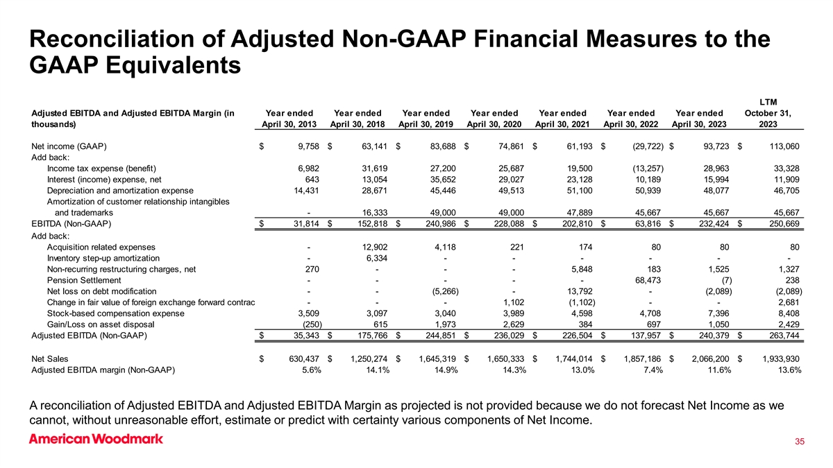 调整后的非GAAP财务指标与GAAP等价物LTM调整后EBITDA和调整后EBITDA利润率的对账(截至年底的年度截至年底的年度截至10月31日的年度,千)2013年4月30日2018年4月30日2019年4月30日2020年4月30日2021年4月30日2022年4月30日2023年净收入(GAAP)9,758美元63,141美元83,688美元74,861美元61,193美元(29,722)93,723美元113,060美元加回:所得税费用(收益)6,98231,61927,20025,68719,500(13,257)28,96333,328利息(收入)费用,净额64313,05435,65229,02723,12810,18915,99411,909折旧和摊销费用14,43128,67145,44649,51351,10050,93948,07746,705客户关系无形资产和商标摊销-16,33349,00049,00047,88945,66745,667 EBITDA(Non-GAAP)31,814美元152,818美元240,986美元228,088美元202,810美元63,816美元232,424美元250,669加回:收购相关费用-12,9024,118221174808080库存增加摊销-6,334------非经常性重组费用,净额270---5,8481831,5251,327养老金结算----68,473(7)238债务修改净损失--(5,266)-13,792-(2,089)(2,089)外汇远期合约公允价值变动---1,102(1,102)--2,681股票补偿费用3,5093,0973,0403,9894,5984,7087,3968,408资产处置损益(250)6151,9732,6293846971,0502,429调整后EBITDA(非美国通用会计准则)35,343美元175,766美元244,851美元236,029美元226,504美元137,957美元240,379美元263,744美元净销售额630,437美元1,250,274美元1,645,319美元1,650,333美元1,744,014美元1,857,186美元2,066,200美元1,933,930美元调整后EBITDA利润率(非美国通用会计准则)5.6% 14.1% 14.9% 14.3% 13.0% 7.4% 11.6% 13.6%未按预测提供调整后EBITDA和调整后EBITDA利润率的对账,因为我们没有预测净收入,因为我们无法在没有不合理努力的情况下,以确定的方式估计或预测净收入的各个组成部分。35