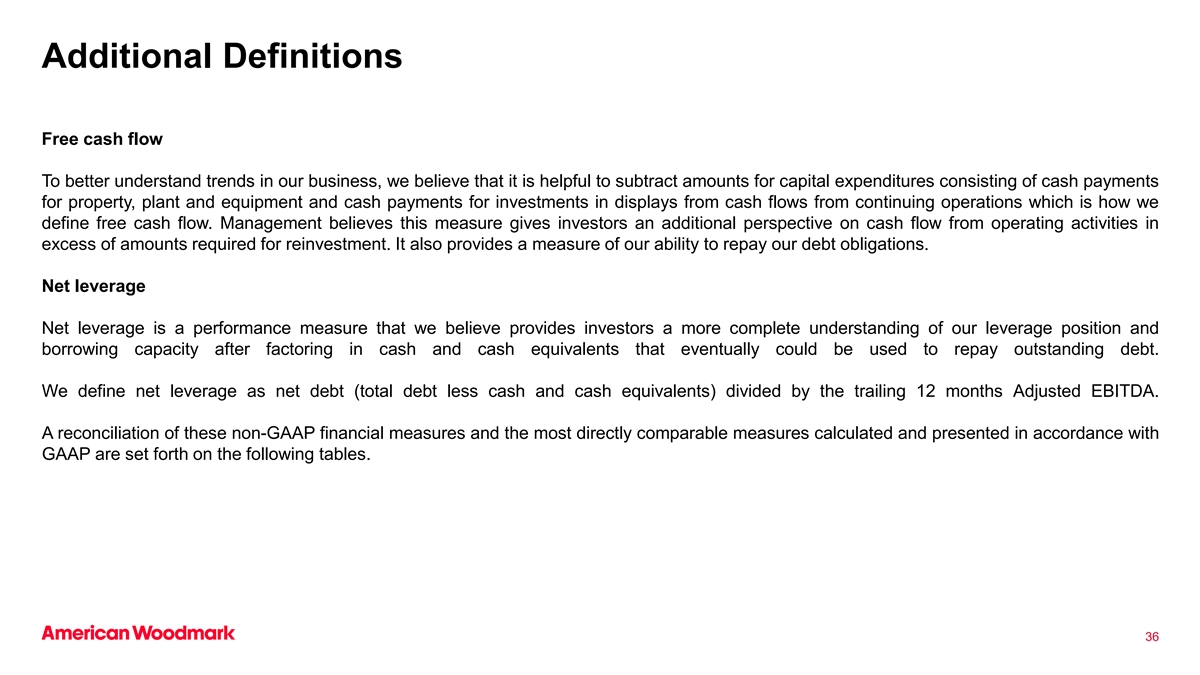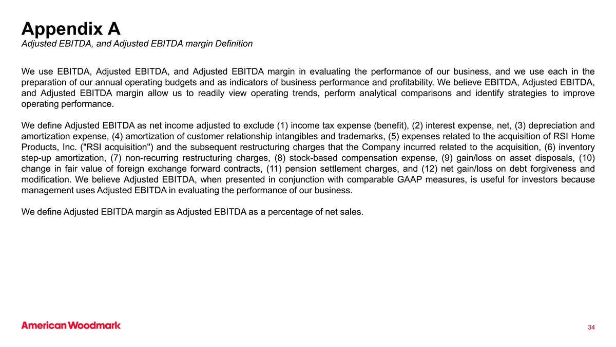 附录A调整后EBITDA,以及调整后EBITDA利润率定义我们使用EBITDA、调整后EBITDA和调整后EBITDA利润率来评估我们的业务表现,我们在编制年度经营预算时使用每一个,并作为业务表现和盈利能力的指标。我们相信EBITDA、调整后EBITDA和调整后EBITDA利润率使我们能够轻松查看经营趋势、进行分析比较并确定提高经营业绩的策略。我们将调整后EBITDA定义为调整后的净收入,以排除(1)所得税费用(收益),(2)利息费用,净额,(3)折旧和摊销费用,(4)客户关系无形资产和商标的摊销,(5)与收购RSI Home Products,Inc.(RSI收购)相关的费用以及公司因收购而产生的后续重组费用,(6)库存升级摊销,(7)非经常性重组费用,(8)基于股票的补偿费用,(9)资产处置的损益,(10)外汇远期合约的公允价值变动,(11)养老金结算费用,(12)债务免除和修改的净损益。我们认为,当调整后的EBITDA与可比的GAAP指标一起列报时,对投资者是有用的,因为管理层在评估我们业务的表现时使用了调整后的EBITDA。我们将调整后EBITDA利润率定义为调整后EBITDA占净销售额的百分比。34
